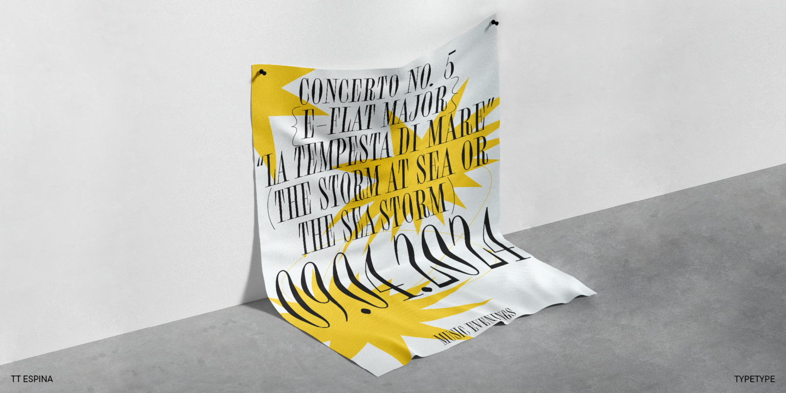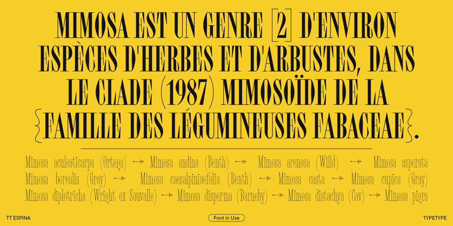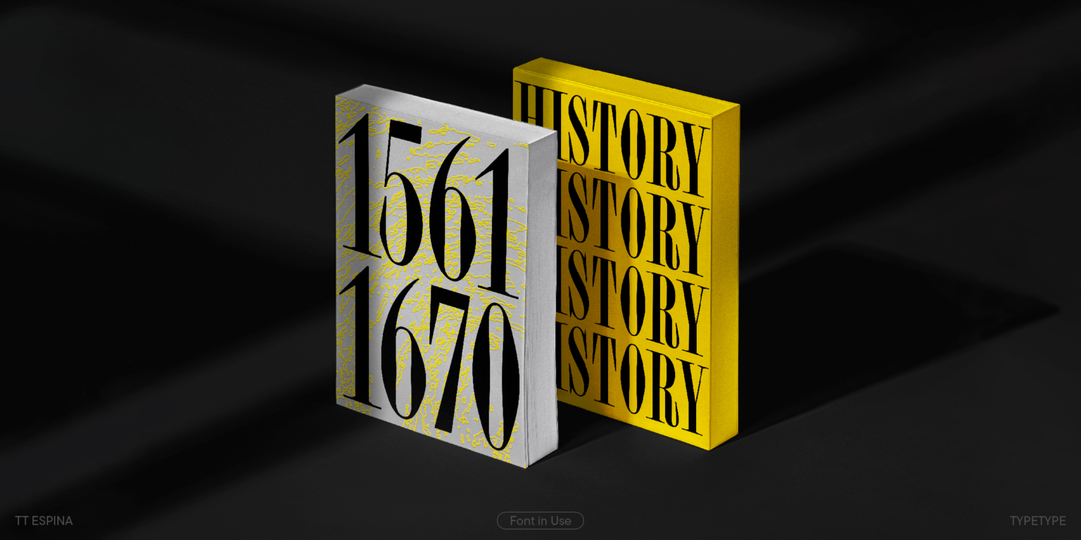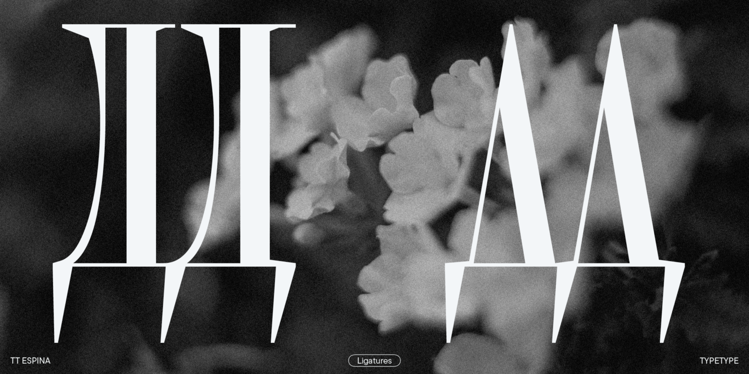 TT Espina es una serifa de exhibición con serifas expresivas. Al crearlo, los diseñadores se inspiraron en la forma histórica de la letra «O», que adoptó la forma de un diamante debido a la calidad de la impresión. El resultado es una tipografía moderna con un alto contraste entre horizontales y verticales.