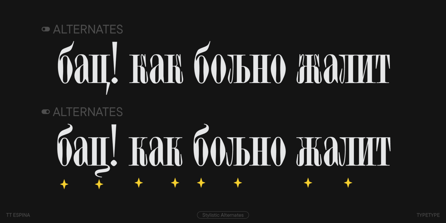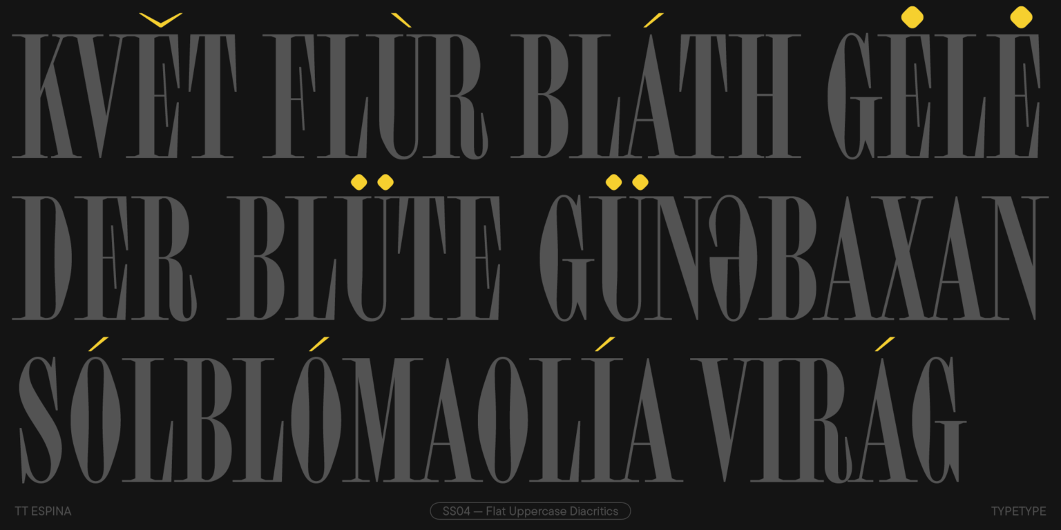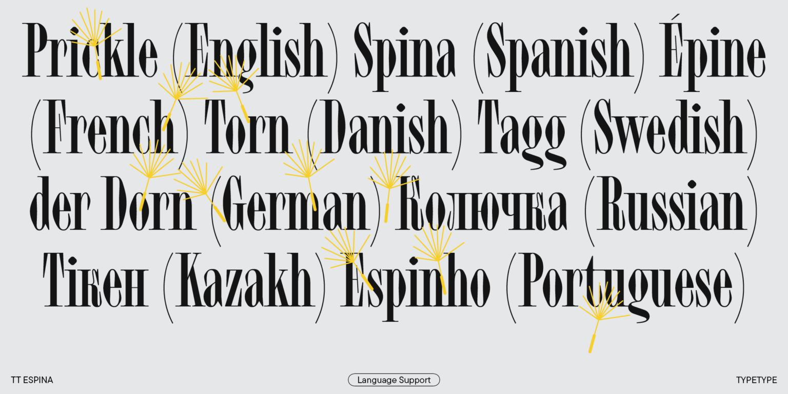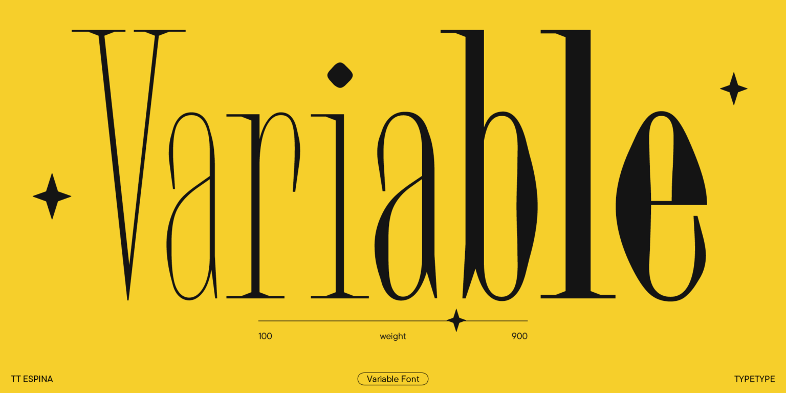 TT Espina es una serifa de exhibición con serifas expresivas. Al crearlo, los diseñadores se inspiraron en la forma histórica de la letra «O», que adoptó la forma de un diamante debido a la calidad de la impresión. El resultado es una tipografía moderna con un alto contraste entre horizontales y verticales.