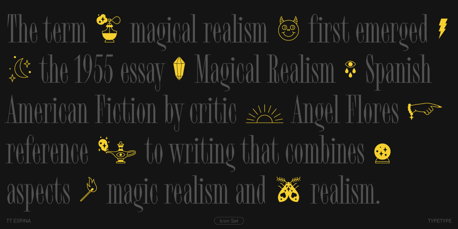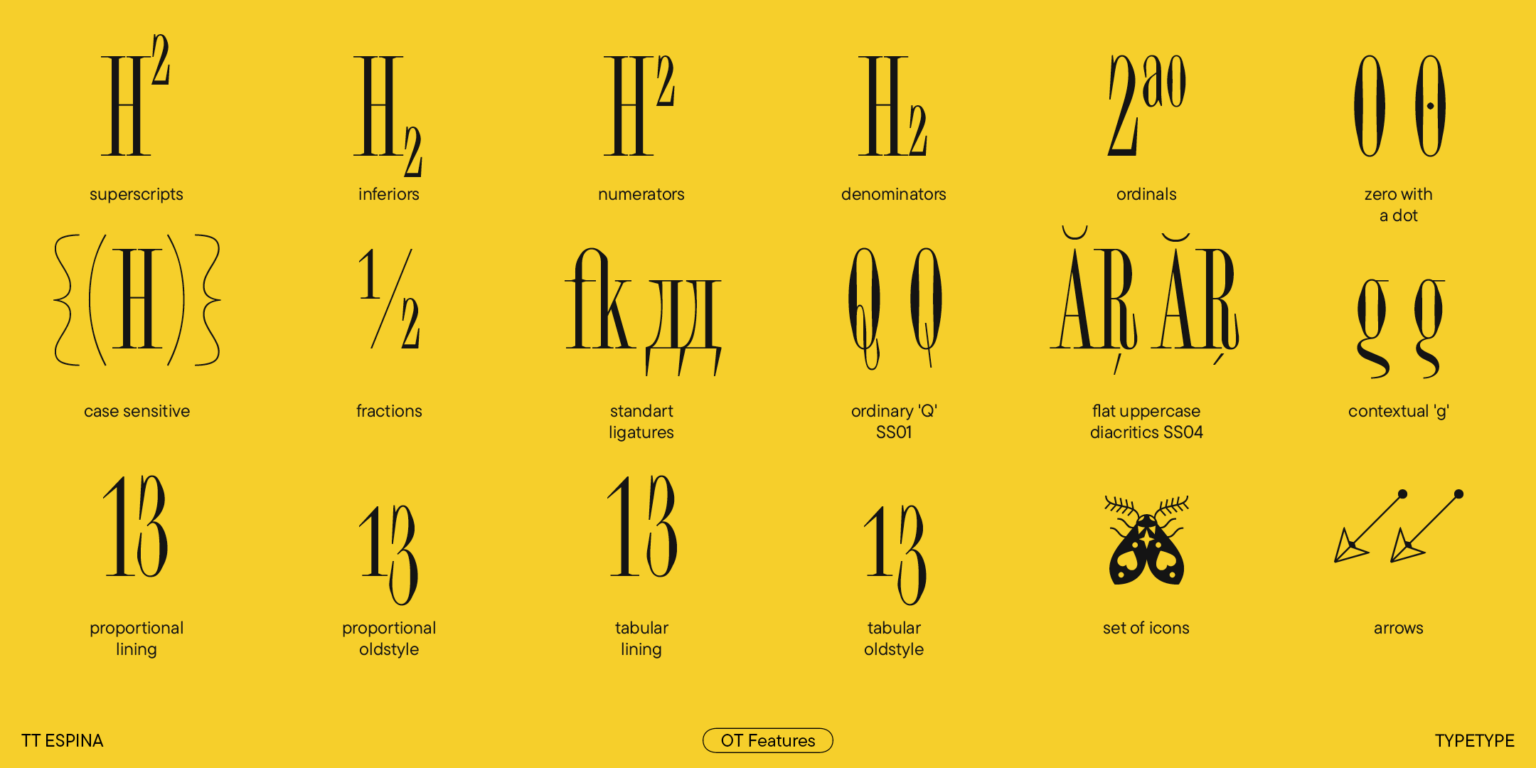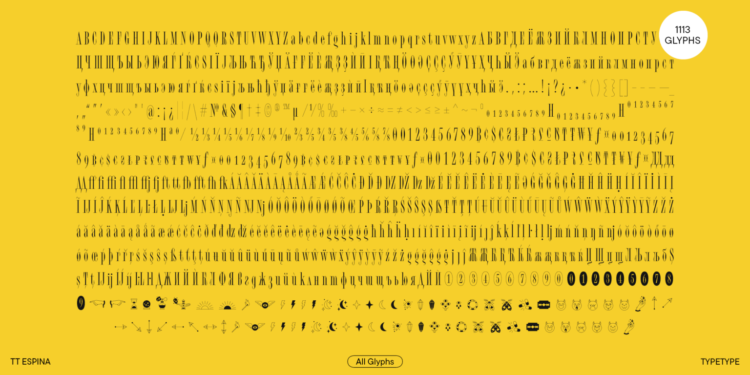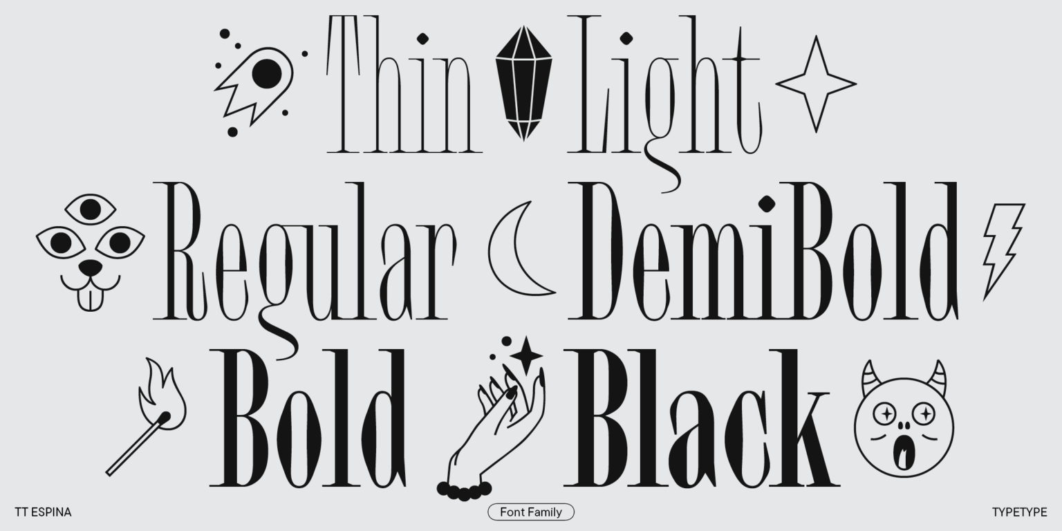 Esta fuente es fácil de distinguir de otras serifas, en primer lugar, por sus estrechas proporciones, así como por su alto contraste, sus expresivas y grandes serifas, su abertura cerrada y sus círculos en forma de diamante. Las estrechas señales confieren al TT Espina una estética especial. Quieres mirar de cerca cada letra, por eso los encabezados diseñados por TT Espina definitivamente llamarán la atención. Una buena adición para los diseñadores es un amplio conjunto de íconos diferentes.