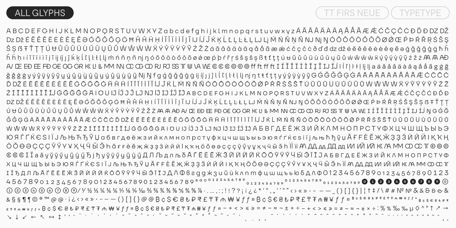 TT Firs Neue admite una gran cantidad de funciones OpenType útiles, incluidas formas alternativas de glifos. La familia tipográfica también incluye una fuente variable, que varía en dos ejes: peso e inclinación. Todo esto permite a los diseñadores adaptar la fuente a sus necesidades específicas, revelando nuevas facetas de su versatilidad.