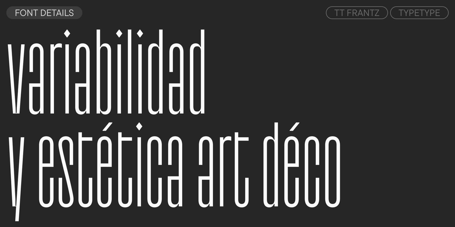 TT Frantz es una grotesca experimental de exhibición con proporciones estrechas. En ella se pueden encontrar sutiles guiños a la estética Art Déco, expresados en la altura extremadamente baja o, por el contrario, extremadamente alta de la línea media de las letras. Gracias a su funcionalidad de fuente variable, es posible modificar por cuenta propia la altura de esta línea. Además, según la posición del control deslizante del eje de ajuste, cambia también el grado de cierre de la abertura en algunas letras.