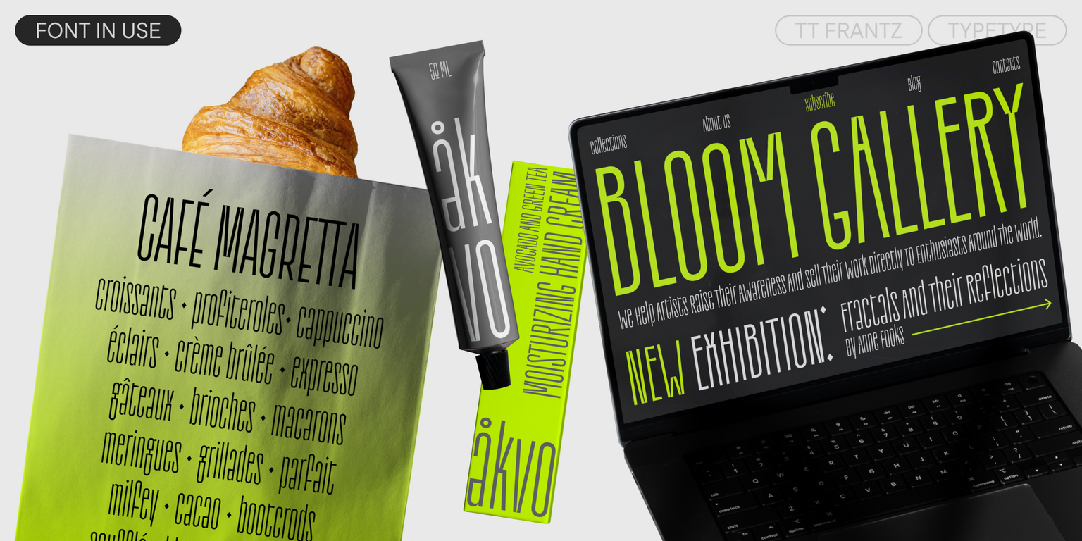 TT Frantz es una fuente decorativa adecuada para su uso en tamaños grandes y medianos. Aportará encanto a cualquier proyecto: se verá impresionante en el diseño de envases para cosméticos y perfumes, en portadas de revistas de moda y arte y en carteles de obras teatrales y exposiciones artísticas.