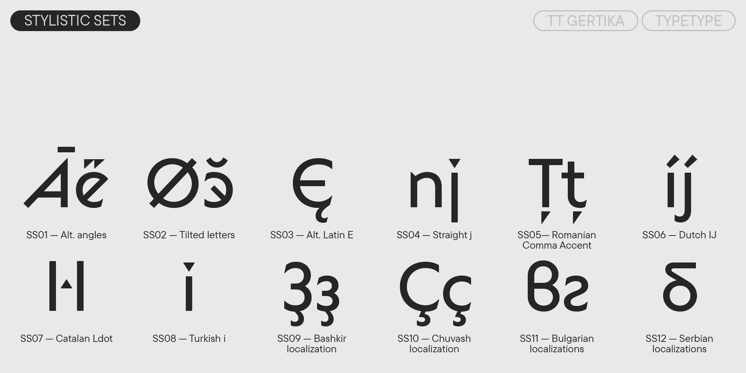 Gracias a los conjuntos estilísticos, el estilo y las características visuales de la fuente pueden transformarse significativamente: se puede hacer que parezca más estricto y dinámico o, por el contrario, redondeada y suave. Además, el tipo de letra incluye una fuente variable que varía a lo largo del eje de peso. Esto hace que el estilo de TT Gertika sea aún más fácil de adaptar a sus necesidades.