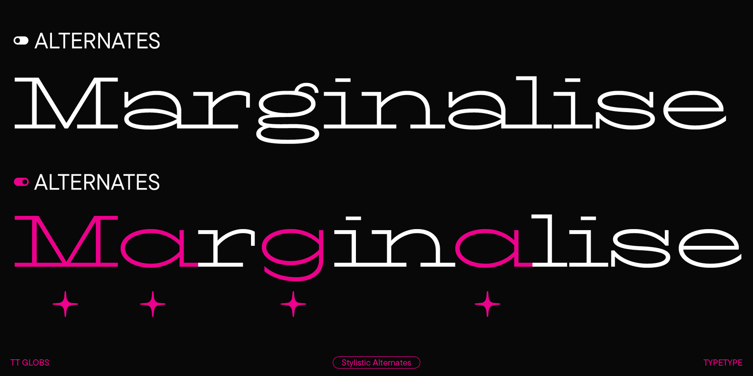 La principal característica visual de TT Globs son las serifas largas, que junto con