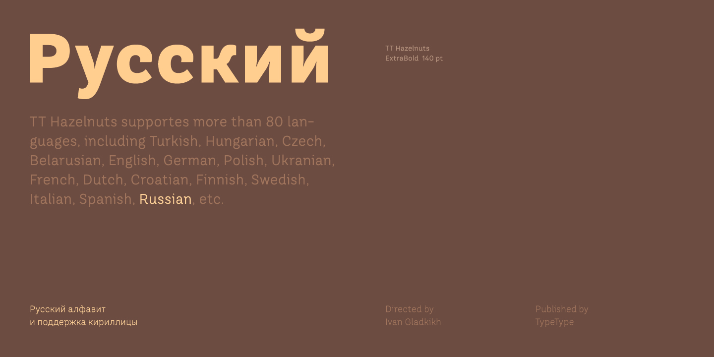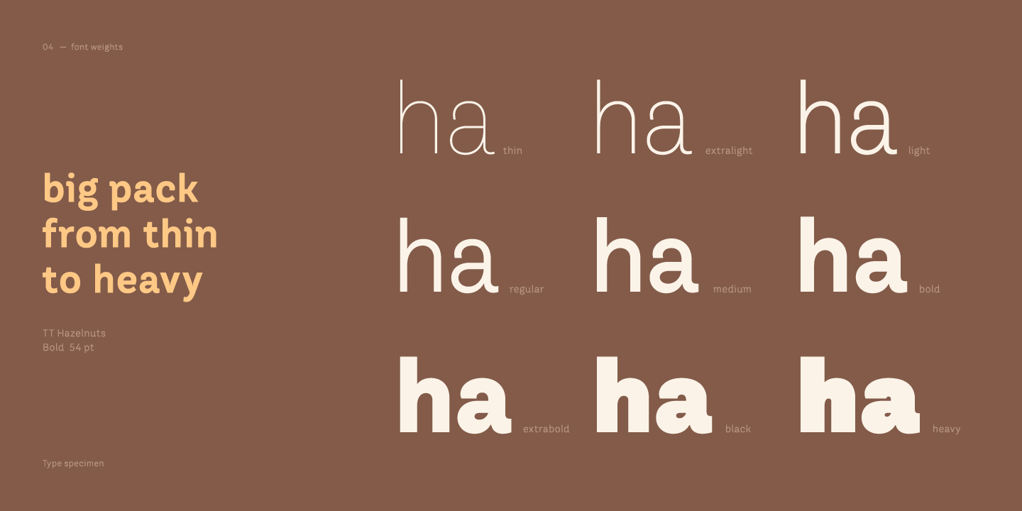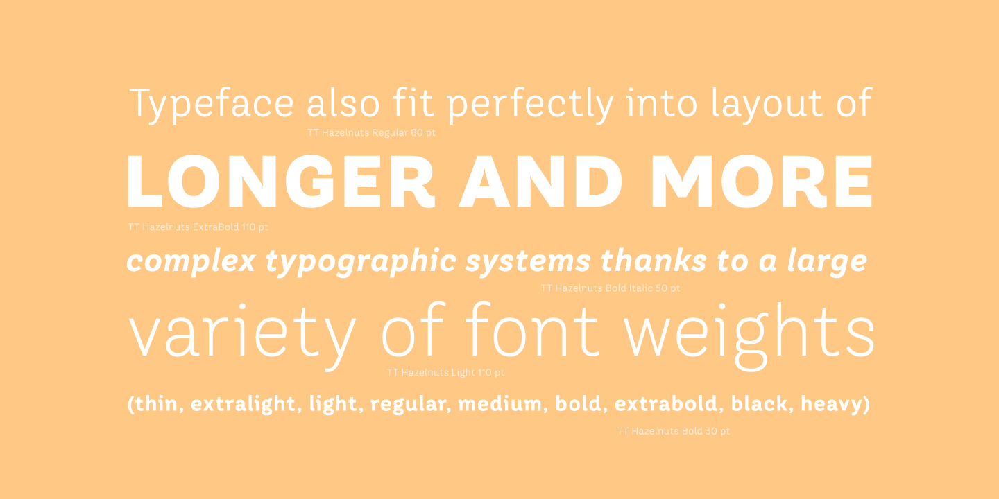La familia de fuentes TT Hazelnuts es perfecta para escribir pequeños bloques de texto, por ejemplo, en la industria de la moda o la publicidad, y también encaja perfectamente en el diseño de sistemas tipográficos más largos y complejos, gracias a la gran abundancia de estilos de diferentes pesos (Fino, Extra ligero, Ligero, Regular, Medio, Negrita, Extra negrita, Negro, Pesado), así como la presencia de cursiva real. Ya se está convirtiendo en una buena tradición incluir un amplio soporte para funciones OT en nuestras nuevas fuentes. TT Hazelnuts no fue una excepción; la fuente utiliza una gran cantidad de funciones útiles: ordn, sinf, sups, numr, dnom, tnum, onum, frac, case.