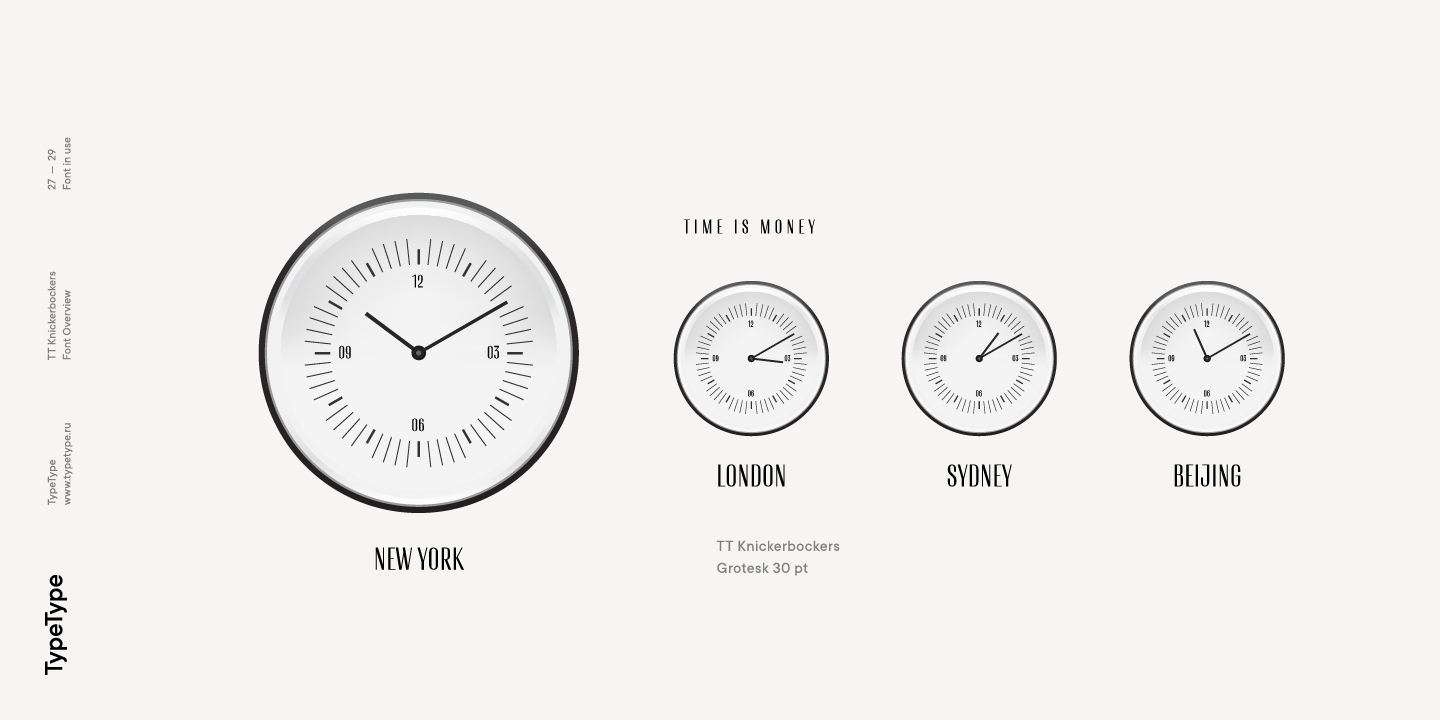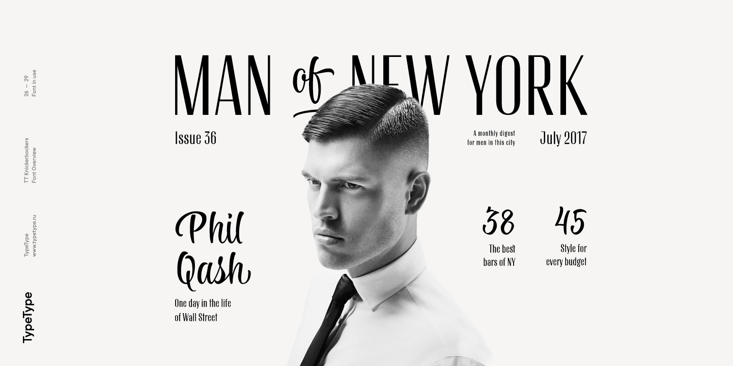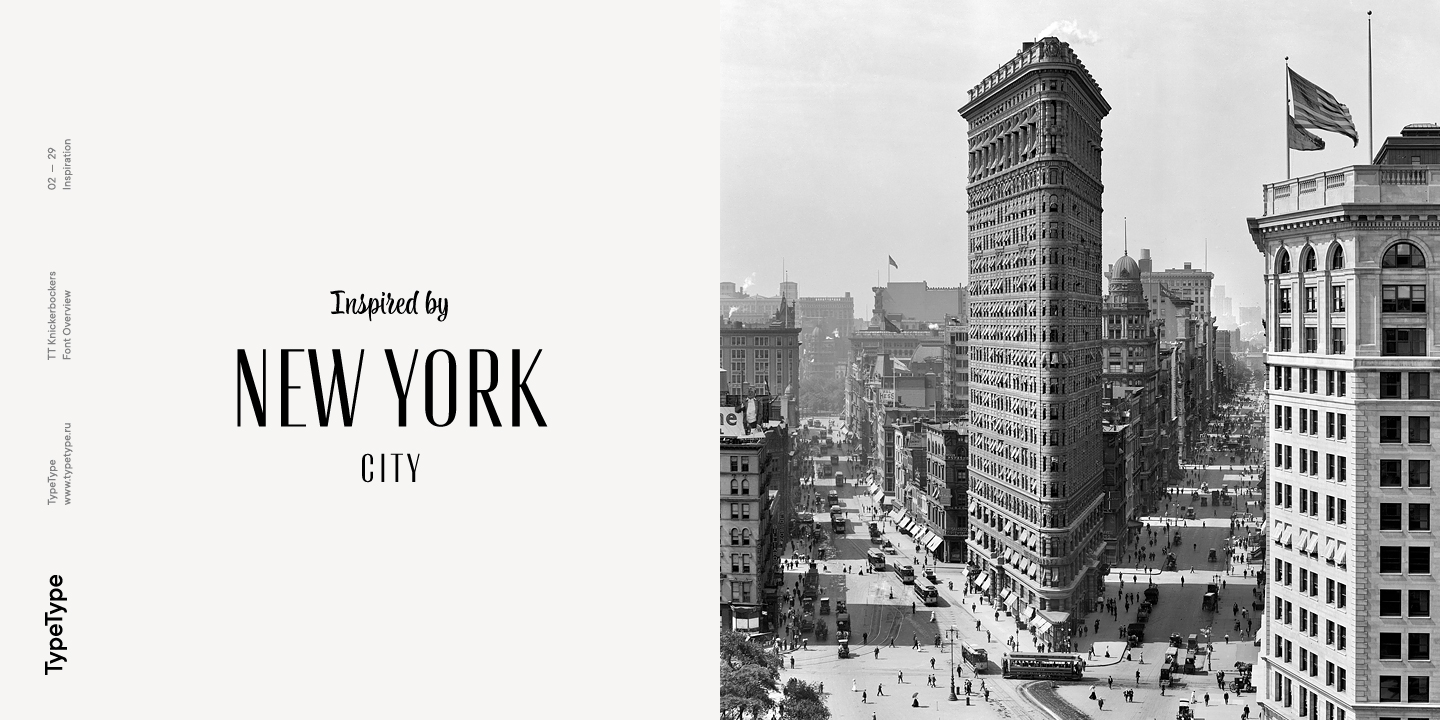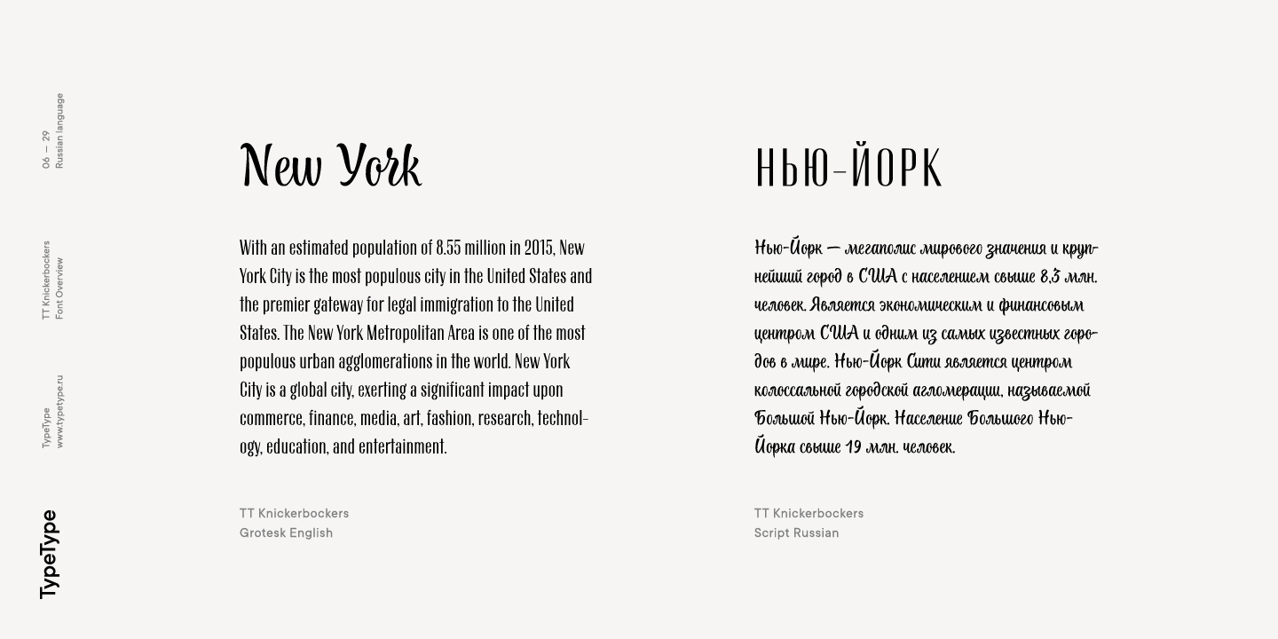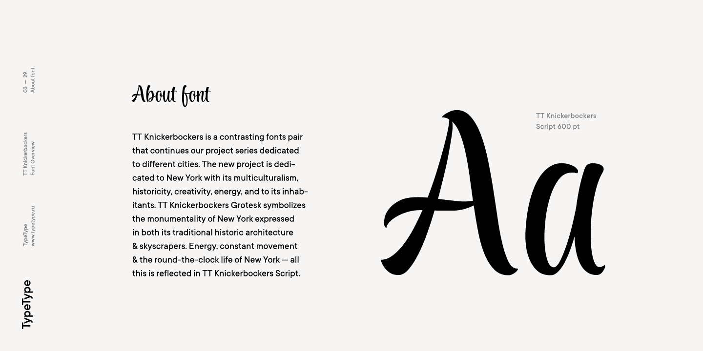 TT Knickerbockers es un par de fuentes contrastantes que continúa nuestra serie de proyectos dedicados a varias ciudades. El nuevo proyecto está dedicado a Nueva York con su multiculturalismo, historia, creatividad y energía, así como a sus habitantes. TT Knickerbockers Grotesk simboliza la monumentalidad expresada tanto en los tradicionales edificios históricos de Nueva York como en sus rascacielos. La energía, el movimiento constante y la vida 24 horas al día, 7 días a la semana de la ciudad de Nueva York se reflejan en nuestro TT Knickerbockers Script.