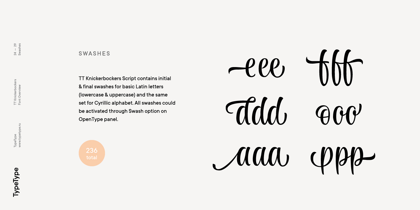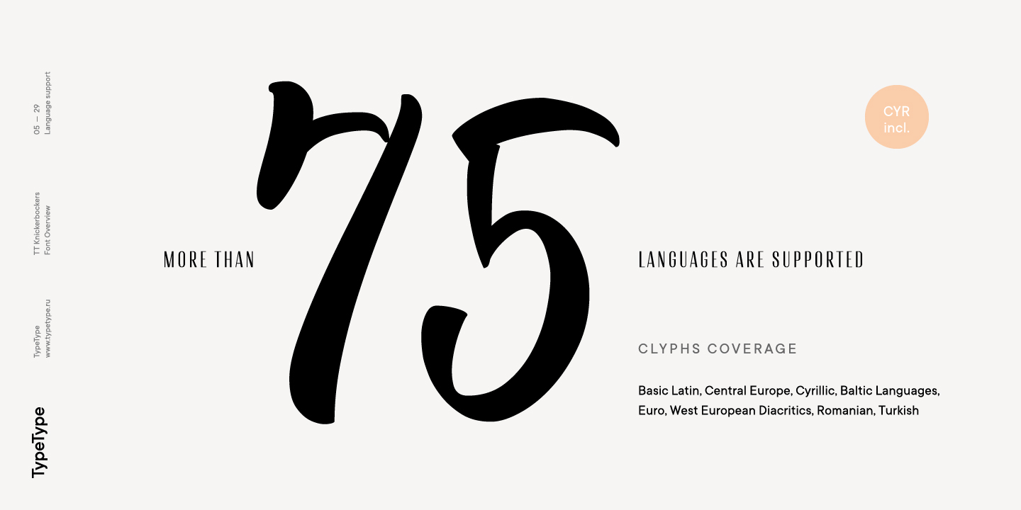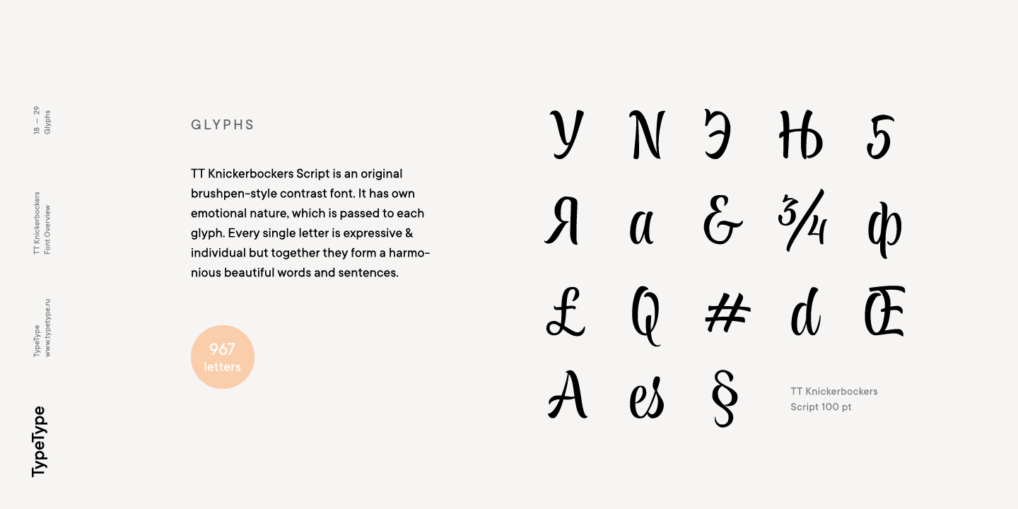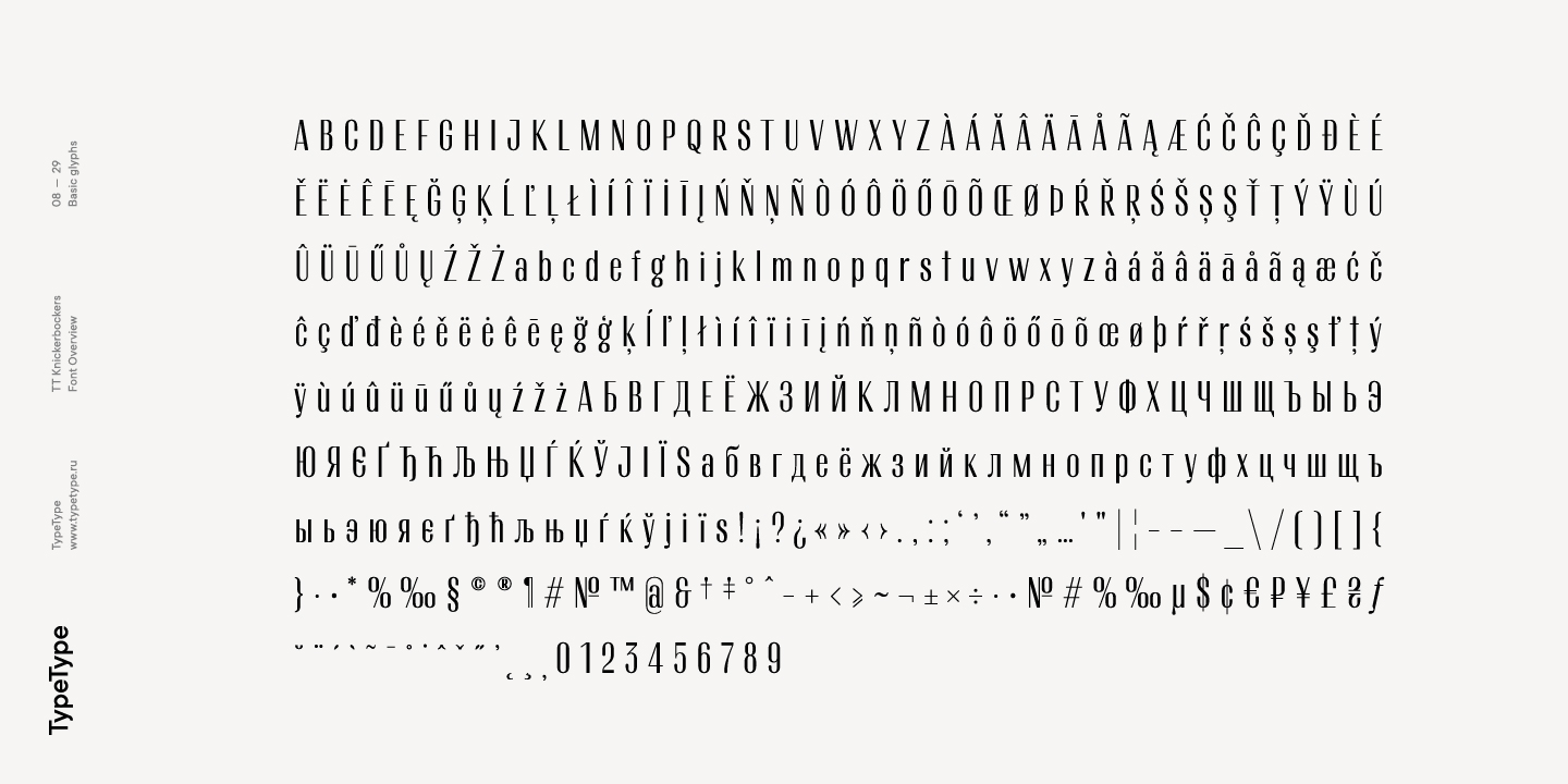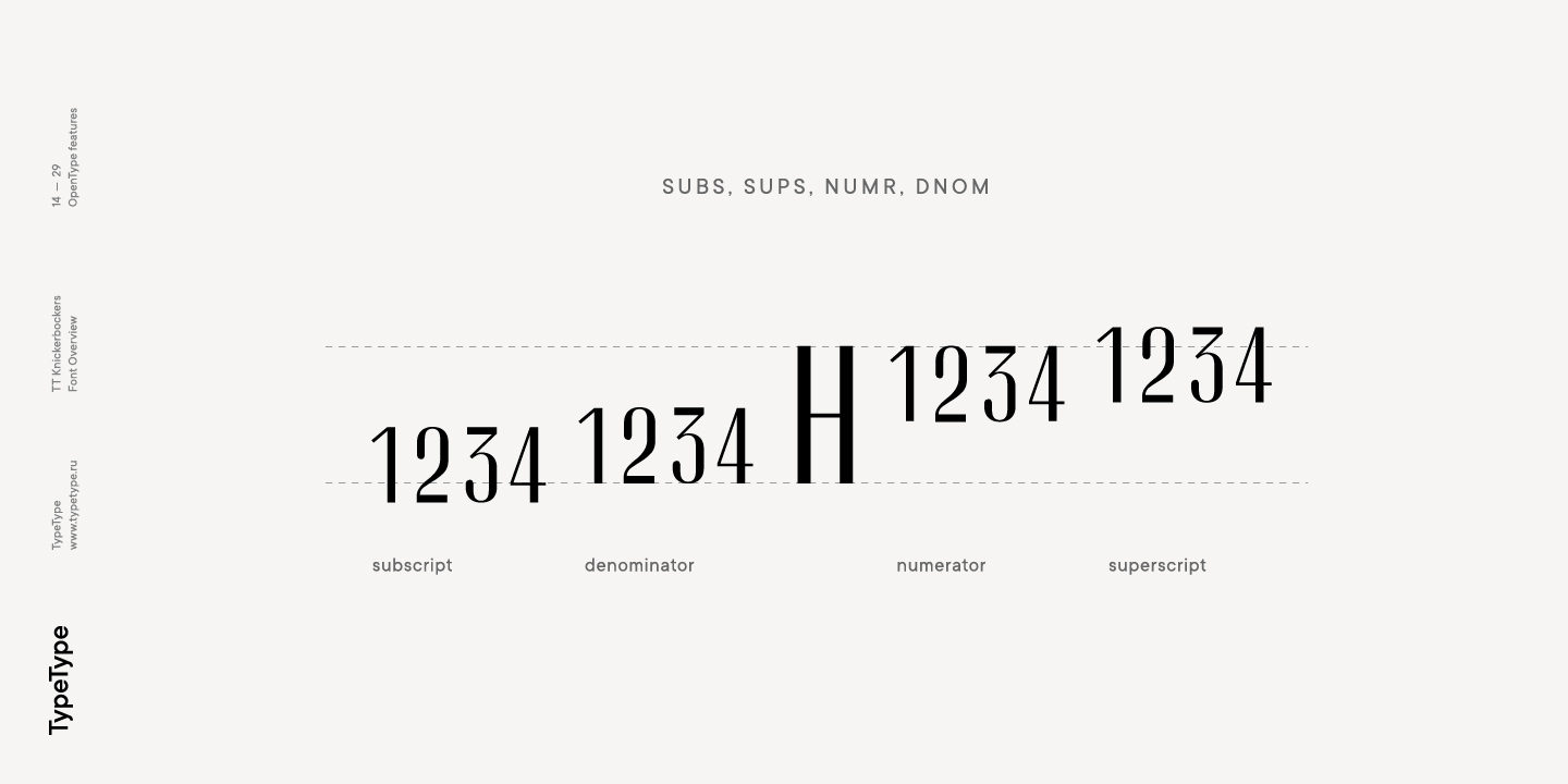 TT Knickerbockers Grotesk es un grotesco estrecho y contrastante con elementos característicos que nos transportan al siglo XIX. La fuente también tiene una referencia a fuentes antiguas: los lugares de las tradicionales serifas antiguas en TT Knickerbockers Grotesk se resuelven utilizando un extremo recto del trazo, y en los lugares de la ubicación tradicional de las gotas hicimos los trazos redondeados. En TT Knickerbockers Grotesk encontrará caracteres inusuales, alternativas estilísticas y ligaduras. La fuente utiliza las siguientes características OpenType: ordn, case, frac, sups, sinf, numr, dnom, onum, tnum, pnum, liga, dlig, salt, ss01.