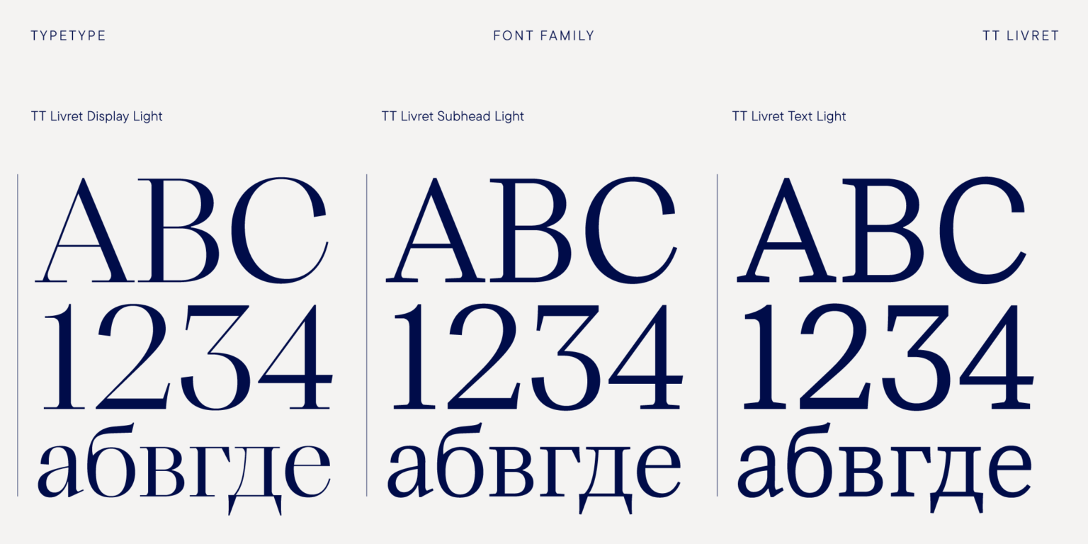 En TT Livret hemos encarnado la idea de una serifa que resultará cómoda de utilizar en las realidades modernas. Se trata de una fuente funcional, donde el estilo del texto no distrae la lectura y el estilo de visualización, por el contrario, llama la atención.
