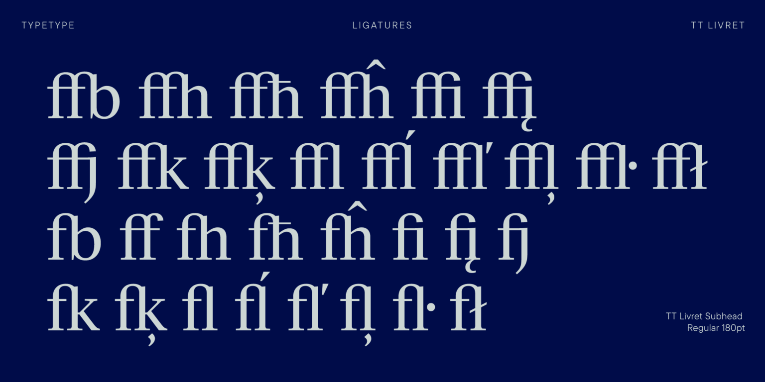 La tipografía TT Livret consta de 32 estilos: 15 estilos verticales, 15 estilos oblicuos y 2 fuentes variables. Cada estilo tiene 1031 glifos. La fuente contiene 26 funciones OpenType, así como una gran cantidad de ligaduras. Hay muchos caracteres alternativos en cursiva, que son especialmente diversos en el alfabeto cirílico.