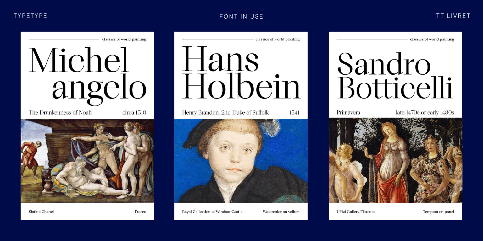 Este tipo de letra luce armonioso en libros y otras publicaciones periódicas, en carteles o en portadas de revistas. El campo de aplicación no se limita sólo a la industria gráfica, ya que TT Livret resulta estéticamente agradable allí donde se utiliza texto.