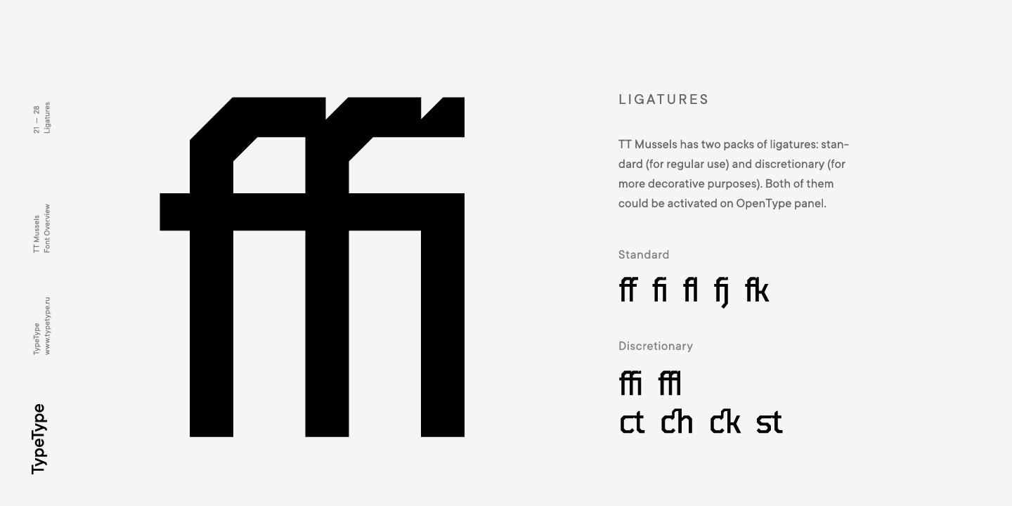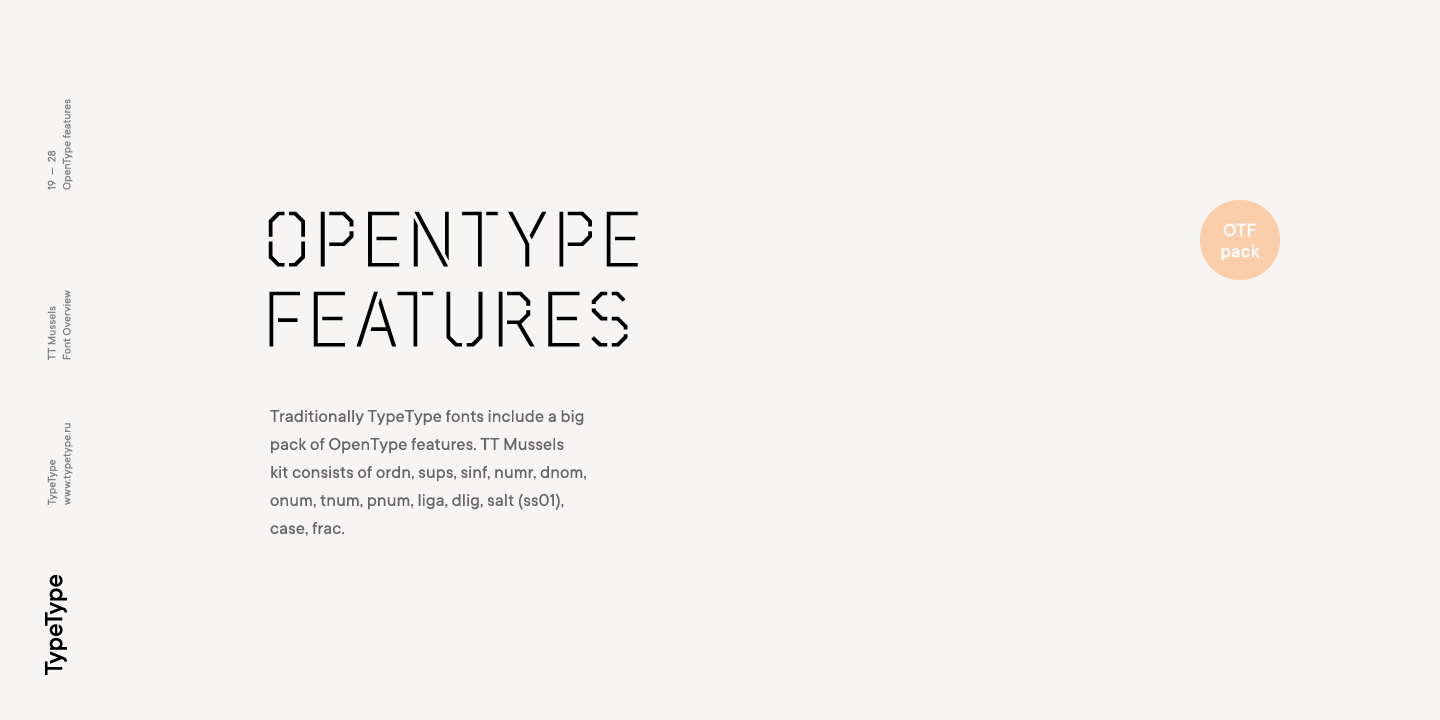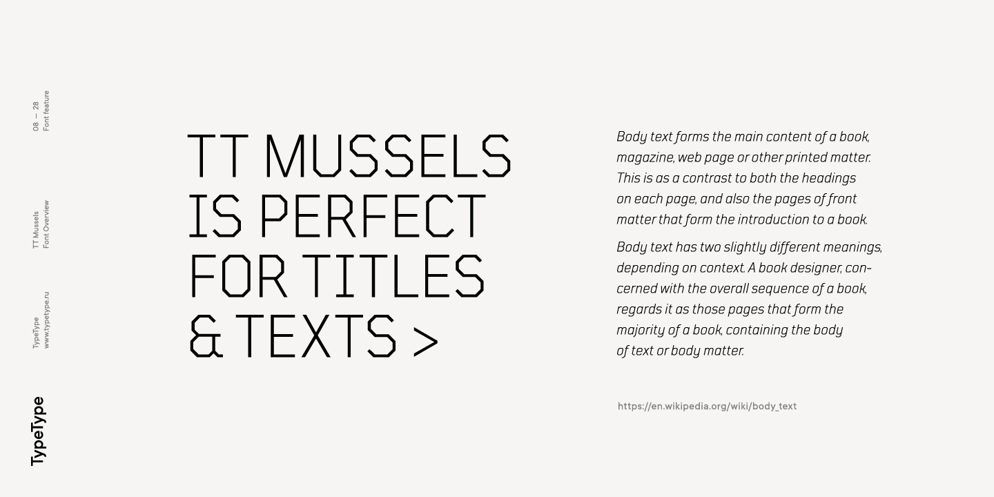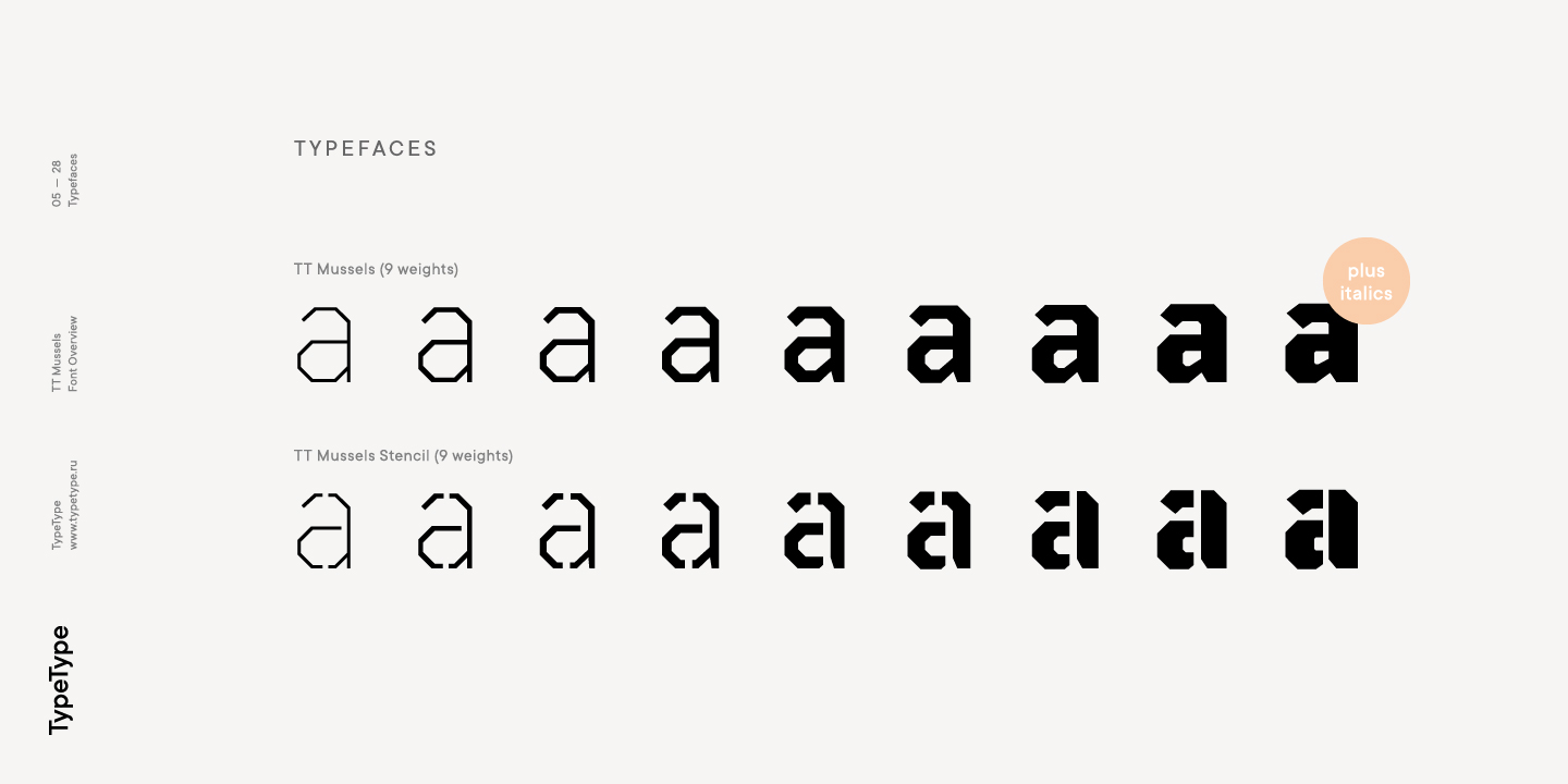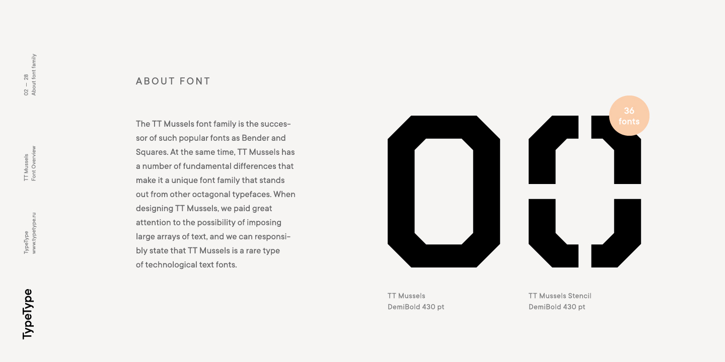 El tipo de letra TT Mussels es el sucesor de fuentes tan populares como Bender y TT Squares. Al mismo tiempo, TT Mussels tiene una serie de diferencias fundamentales que lo convierten en una familia única que se destaca fuertemente entre los auriculares octogonales. Al diseñar TT Mussels, prestamos gran atención a la capacidad de componer grandes cantidades de texto y podemos declarar responsablemente que TT Mussels es un tipo poco común de fuente de texto tecnológico. Además, hemos elaborado una versión estarcida del tipo de letra, en la que la ubicación de los cortes cambia según el grosor del contorno. En total, la familia de fuentes TT Mussels consta de 36 estilos, que, entre otras cosas, incluyen alternativas estilísticas, ligaduras, así como un amplio soporte para funciones OT: case, frac, ordn, sups, sinf, numr, dnom, onum, tnum, pnum, liga, dlig, salt, ss01.