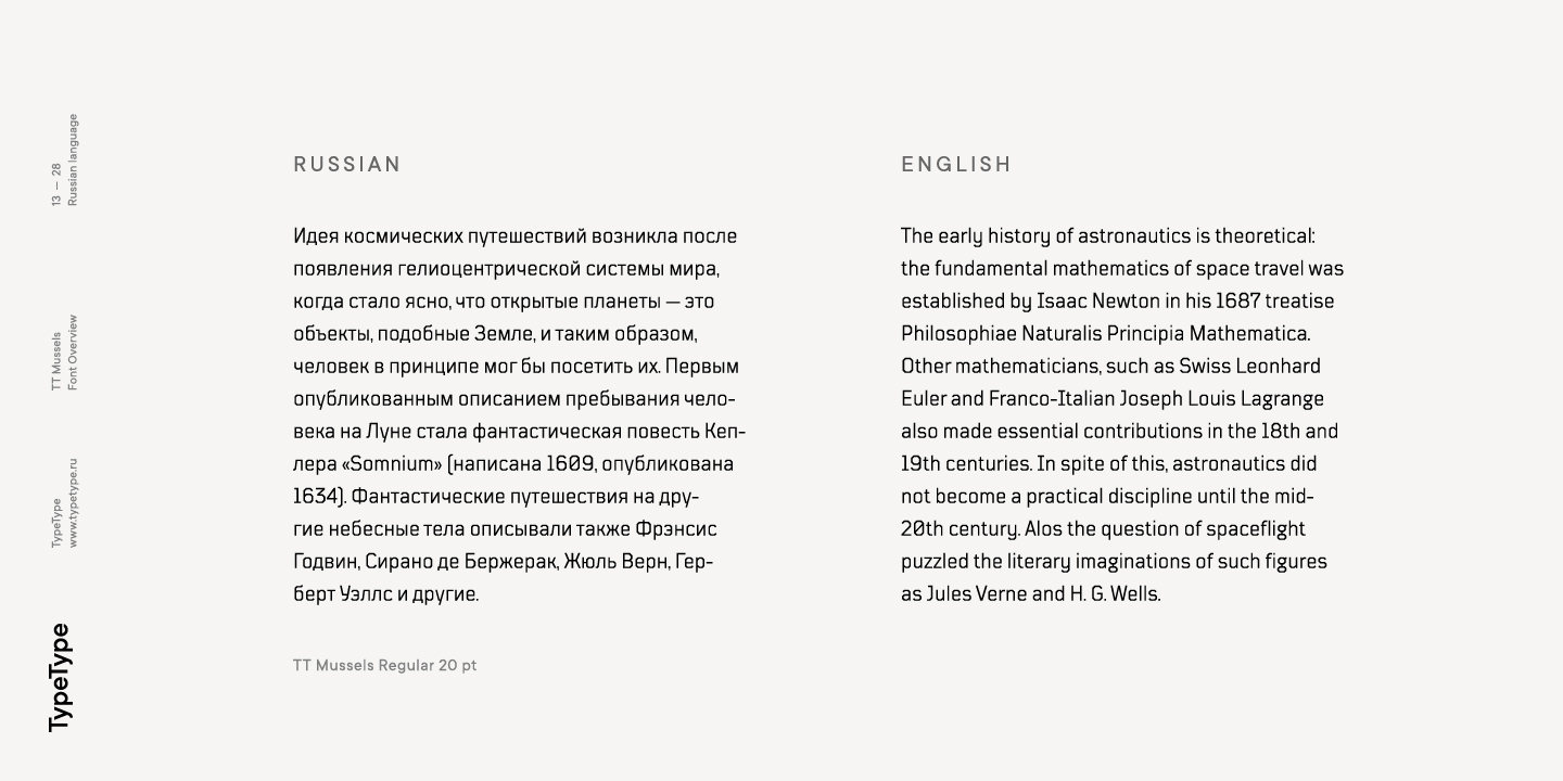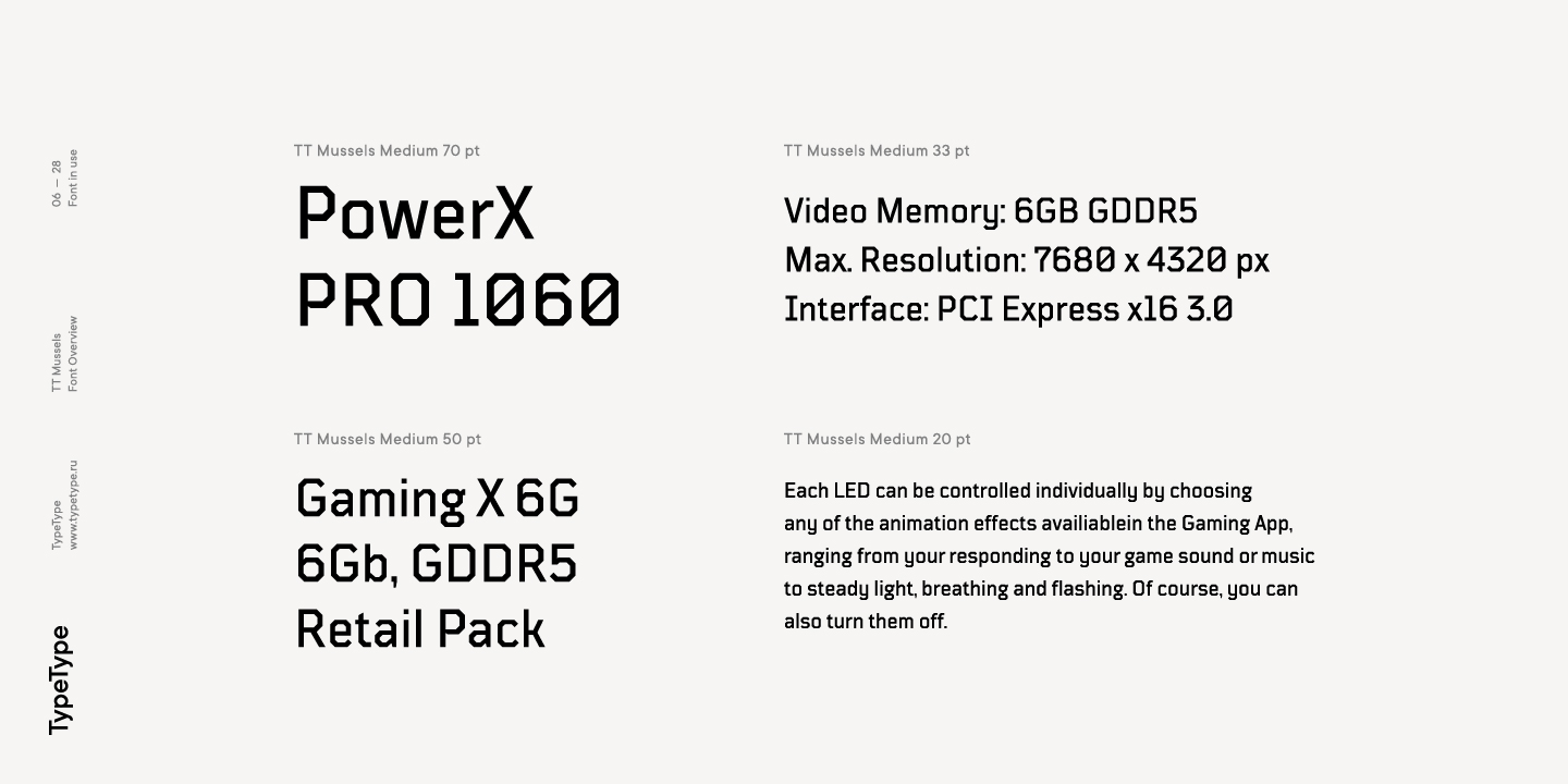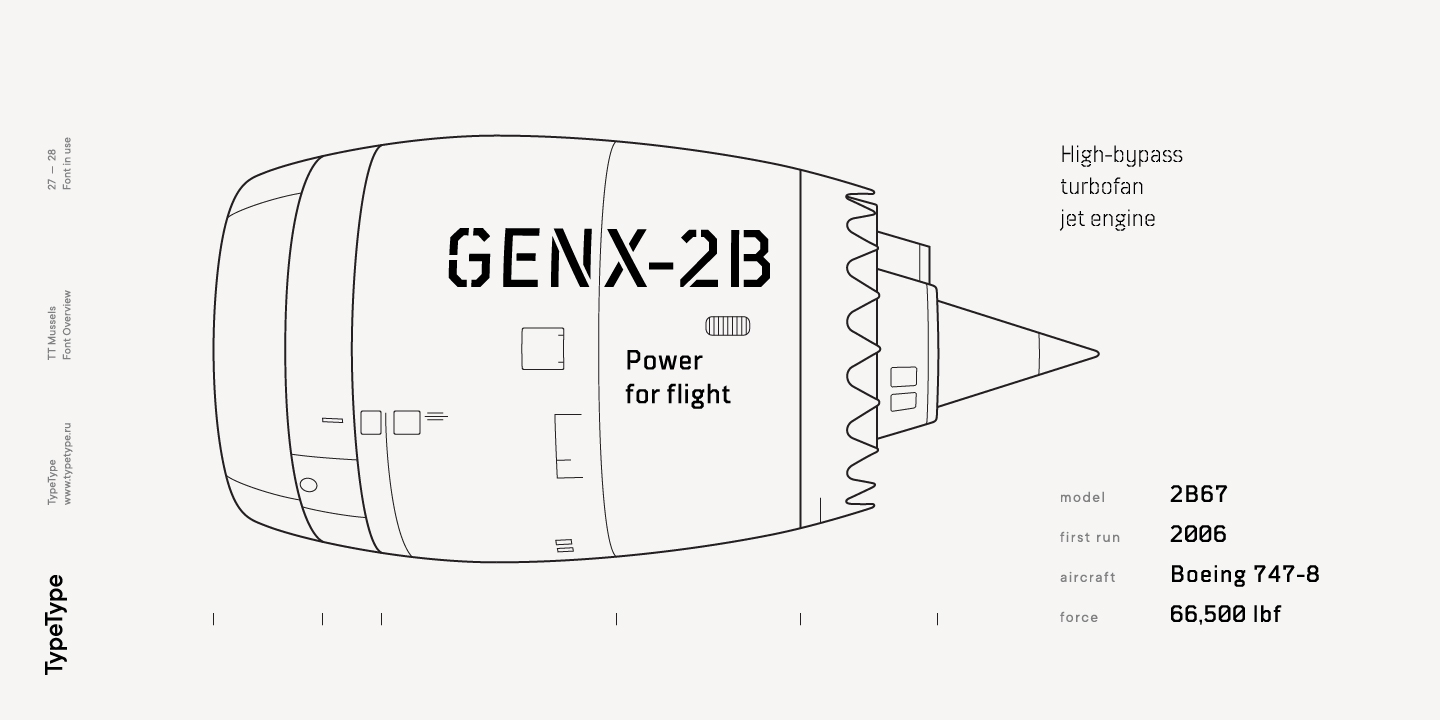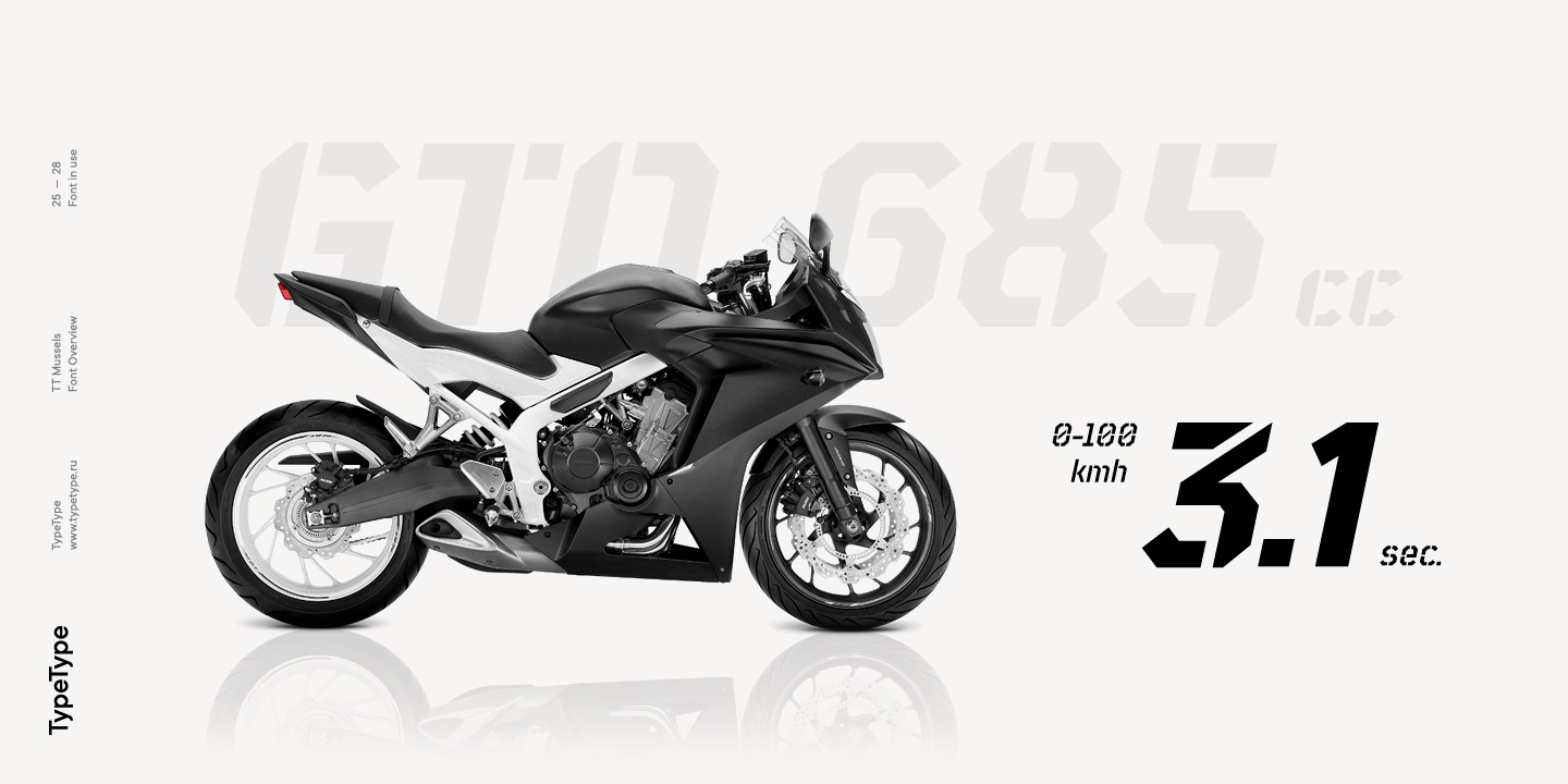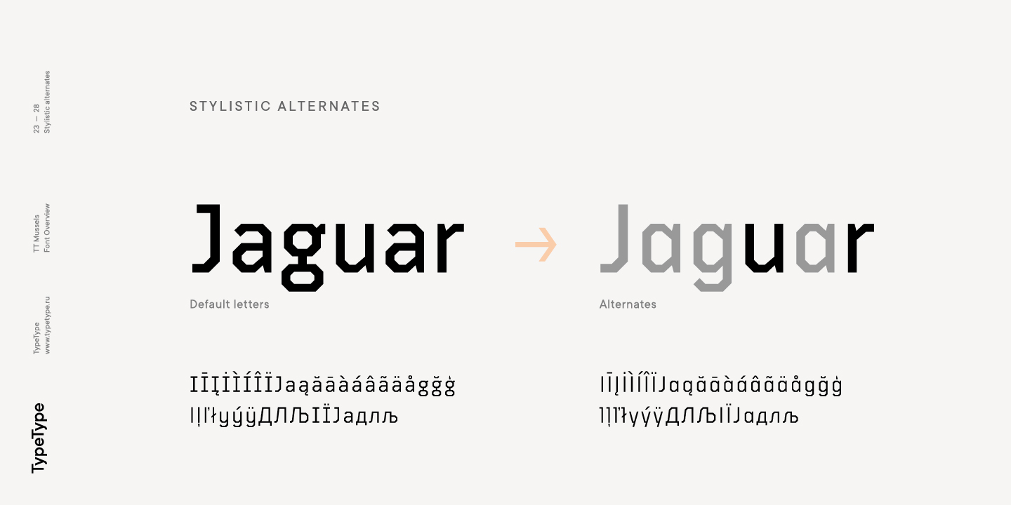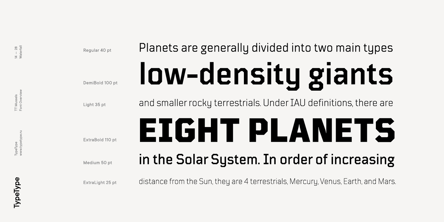 El tipo de letra TT Mussels es el sucesor de fuentes tan populares como Bender y TT Squares. Al mismo tiempo, TT Mussels tiene una serie de diferencias fundamentales que lo convierten en una familia única que se destaca fuertemente entre los auriculares octogonales. Al diseñar TT Mussels, prestamos gran atención a la capacidad de componer grandes cantidades de texto y podemos declarar responsablemente que TT Mussels es un tipo poco común de fuente de texto tecnológico. Además, hemos elaborado una versión estarcida del tipo de letra, en la que la ubicación de los cortes cambia según el grosor del contorno. En total, la familia de fuentes TT Mussels consta de 36 estilos, que, entre otras cosas, incluyen alternativas estilísticas, ligaduras, así como un amplio soporte para funciones OT: case, frac, ordn, sups, sinf, numr, dnom, onum, tnum, pnum, liga, dlig, salt, ss01.