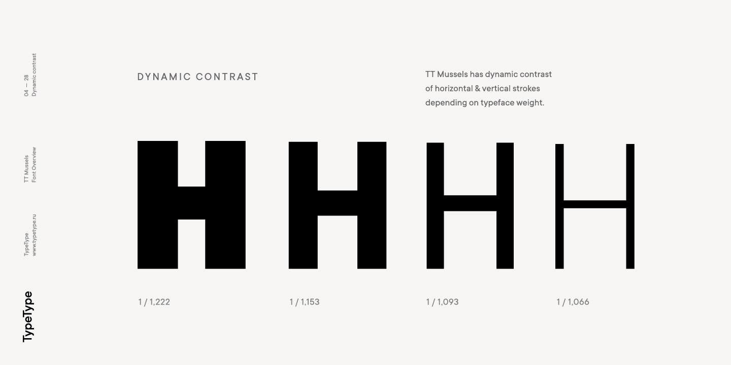 TT Mussels hace un uso extensivo del contraste dinámico, que es más notable en el estilo Black, donde la relación entre el grosor de los trazos verticales y los trazos horizontales es aproximadamente de dos a uno. Acercándonos al contorno fino, el grosor de los trazos verticales ya corresponde al grosor de los trazos horizontales. Los diseños de TT Mussels también presentan otros homenajes a las fuentes de texto tradicionales: las marcas de lápiz históricamente asociadas con las serifas. Usando el ejemplo de la letra M del estilo Negro, podemos ver primero un trazo fino, luego un trazo diagonal grueso, luego un trazo diagonal fino y un último trazo vertical en negrita. Al igual que con el contraste dinámico, este efecto se desvanece a medida que te acercas a una línea delgada. En los estilos en negrita, en lugares como las «axilas» de las letras MNI, así como en la unión de las diagonales WVvw, hay compensadores visuales que aclaran los estilos en negrita. A medida que el grosor de los estilos pasa de negrita a fino, el tamaño y el significado conceptual de los compensadores cambia y en los estilos finos desaparecen por completo.