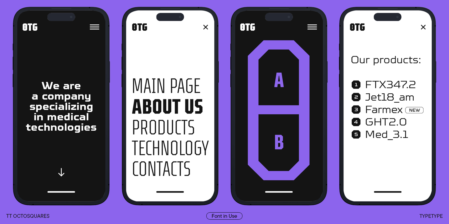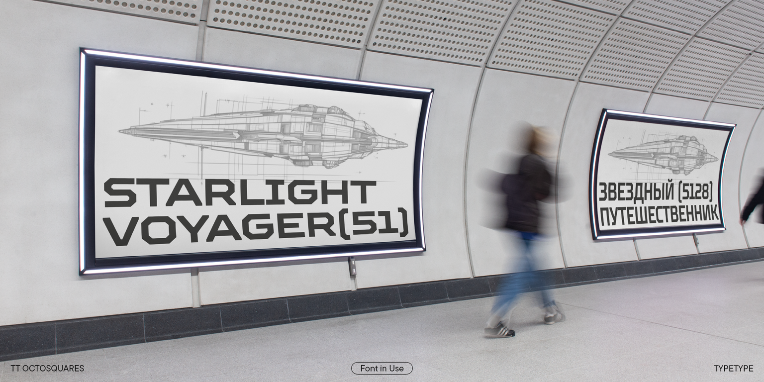TT Octosquares funciona mejor en tamaños grande y mediano: a medida que aumenta, la fuente revela todas sus facetas y parece muy inusual. Sin embargo, en un tamaño pequeño también sigue siendo legible y adquiere un aspecto más minimalista. Esta fuente es perfecta para proyectos relacionados con arquitectura, diseño, moda, tecnología y mucho más. Quedará igualmente espectacular en la portada de una revista científica o en el cartel de una fiesta tecno.