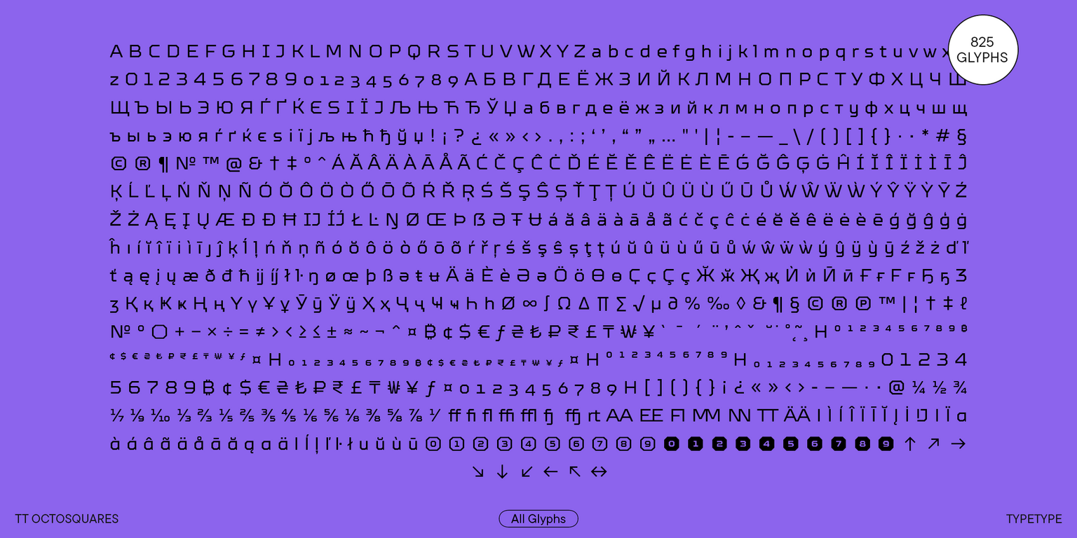 TT Octosquares es un grotesco octogonal con carácter futurista. Es una versión ampliada y muy mejorada de nuestra primera fuente comercial, TT Squares. Hemos hecho que TT Octosquares sea mucho más funcional, fresca y relevante.