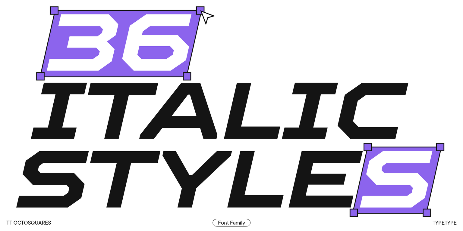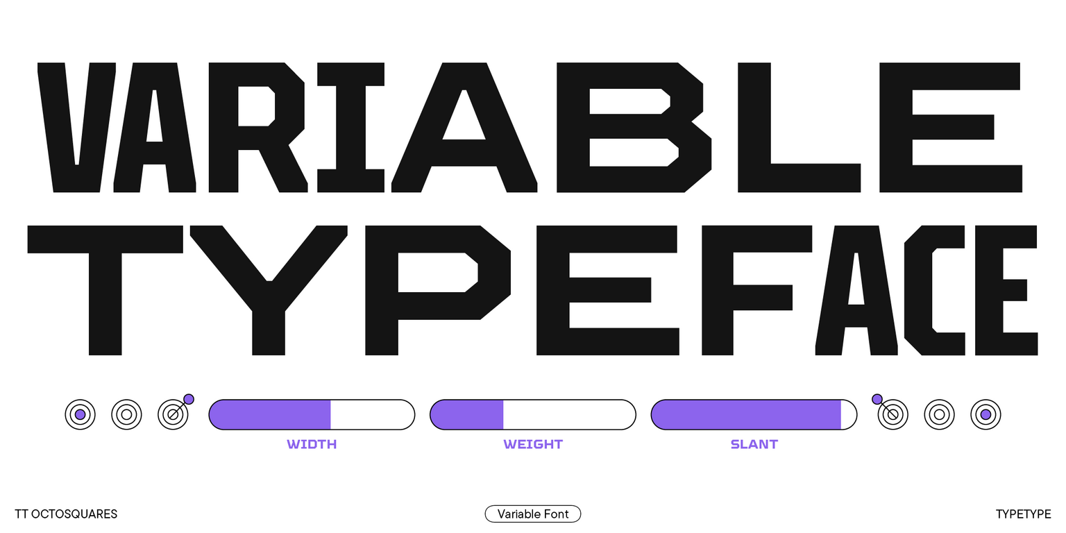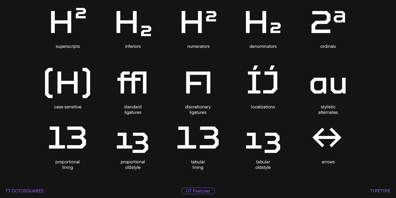 El tipo de letra tiene una fuente variable que puede cambiar según tres ejes: grosor, ancho e inclinación. Esto permite a los diseñadores crear combinaciones únicas y personalizar TT Octosquares para diferentes aplicaciones. Además, la fuente contiene varias alternativas estilísticas, ligaduras, números de estilo antiguo, números en círculos y un cero cruzado.