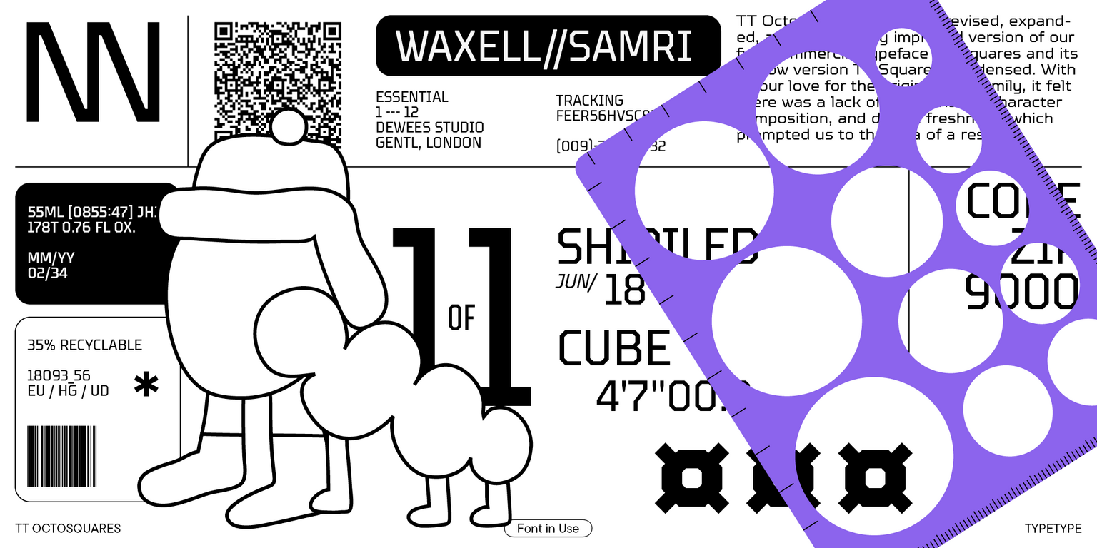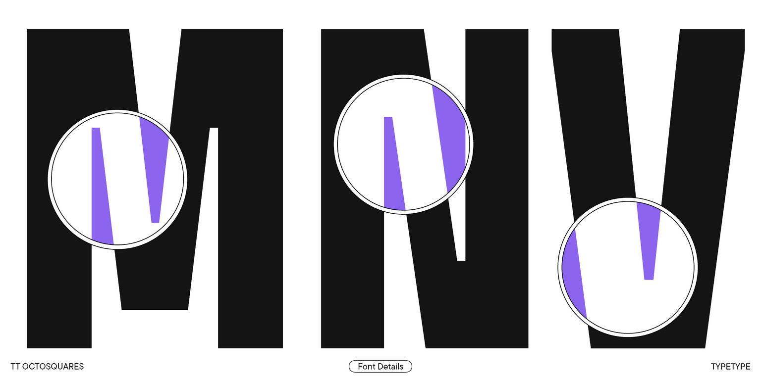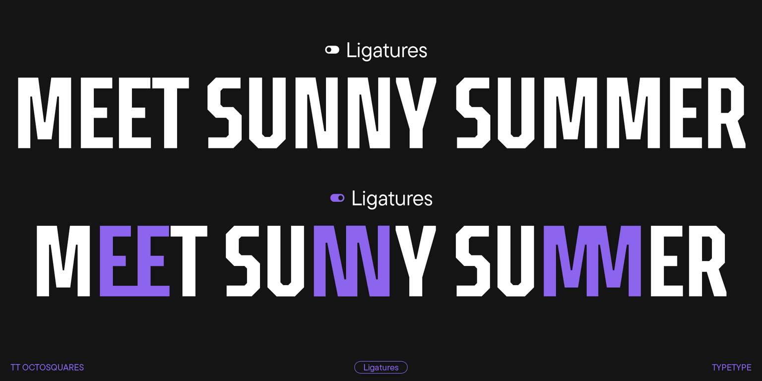 El tipo de letra tiene una fuente variable que puede cambiar según tres ejes: grosor, ancho e inclinación. Esto permite a los diseñadores crear combinaciones únicas y personalizar TT Octosquares para diferentes aplicaciones. Además, la fuente contiene varias alternativas estilísticas, ligaduras, números de estilo antiguo, números en círculos y un cero cruzado.