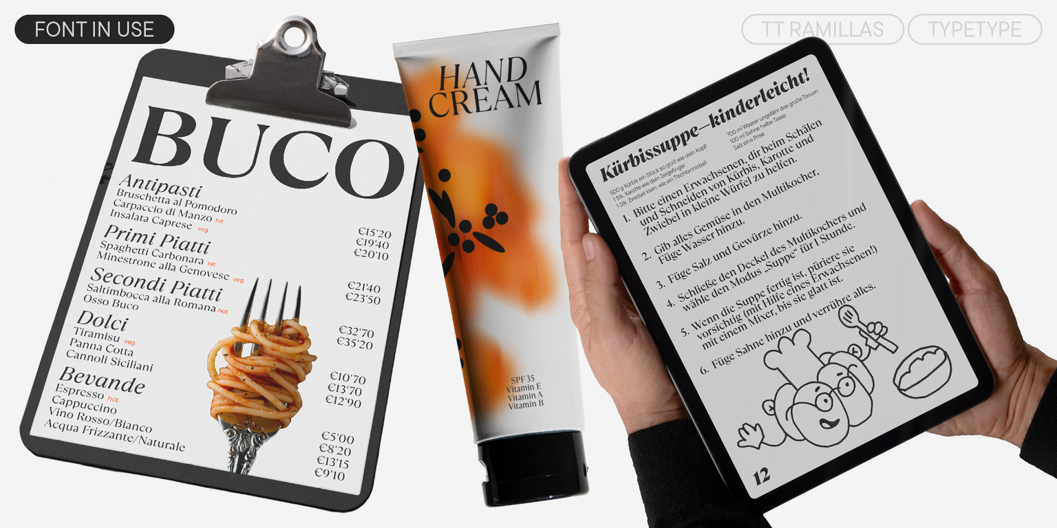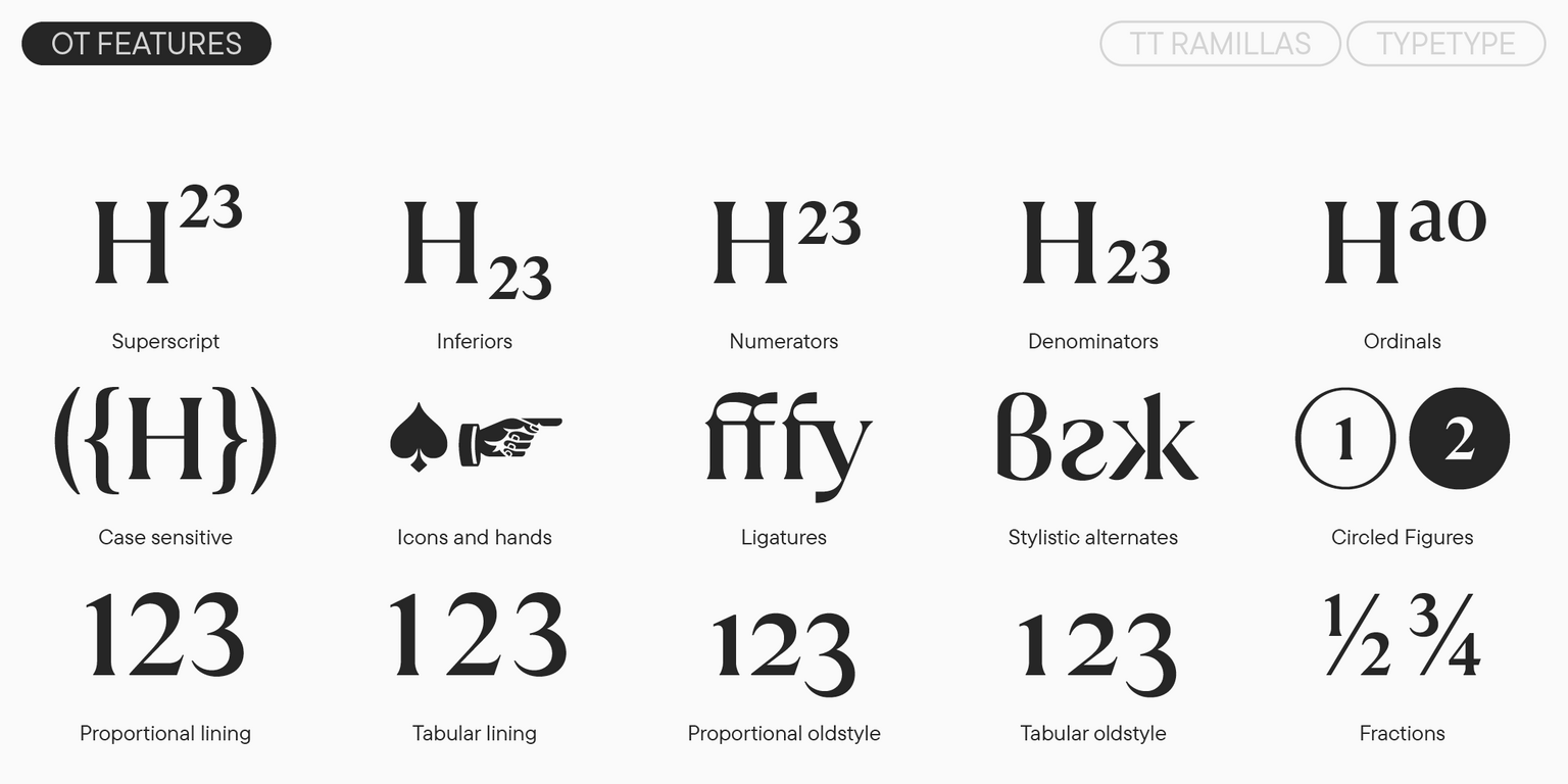 La elegante TT Ramillas es ideal para revistas de moda y arte. También es perfecta para la identidad visual de productos y servicios del segmento premium. Es una fuente versátil: funciona perfectamente en títulos, pero también mantiene legibilidad en pequeños bloques de texto. Además, el hinting manual en TrueType permite su uso en la web y aplicaciones.