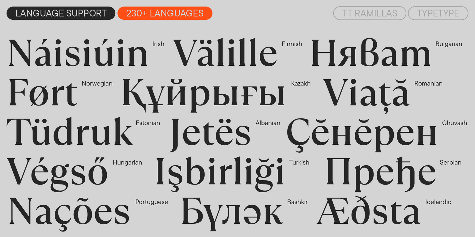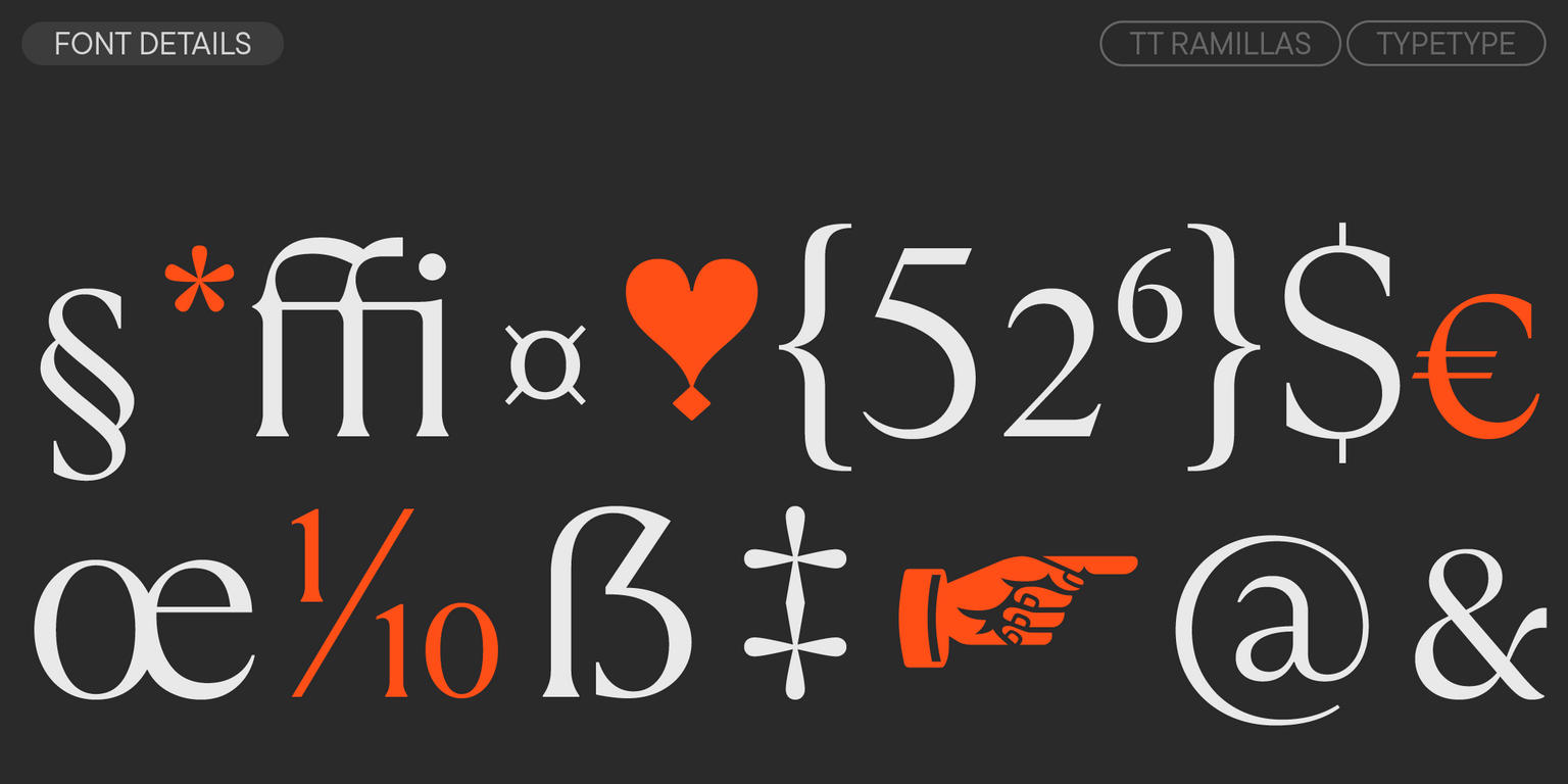 TT Ramillas es una estilizada serif transicional perfectamente adaptada a las realidades y exigencias modernas. Este proyecto comenzó como un experimento: queríamos crear una serif contemporánea con detalles meticulosamente afinados, reinterpretando las formas clásicas y perfeccionando cada glifo. ¡Y lo conseguimos!