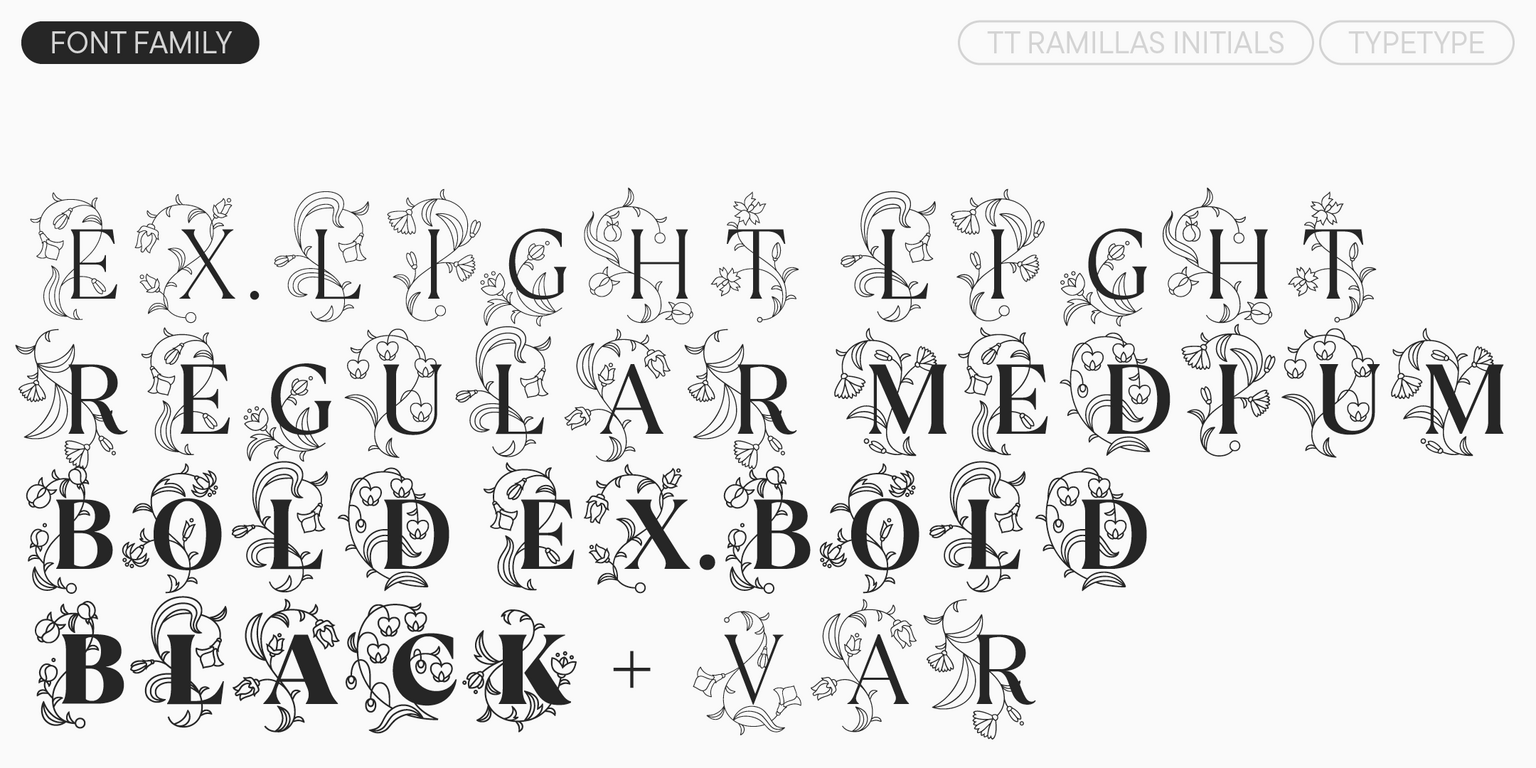La familia incluye subfamilias decorativas Outline y Decor, que, al igual que la versión base, tienen versiones en cursiva. Estas funcionan excepcionalmente bien en títulos y textos destacados. Para los usuarios más exigentes, hemos preparado una versión variable de los estilos principales. Con el control deslizante de variabilidad, puedes ajustar el grosor del trazo de forma personalizada, sin depender de los parámetros de peso existentes. Además, en TT Ramillas Initials, hemos creado letras capitulares con ornamentos florales, ideales para decorar los párrafos iniciales de libros.