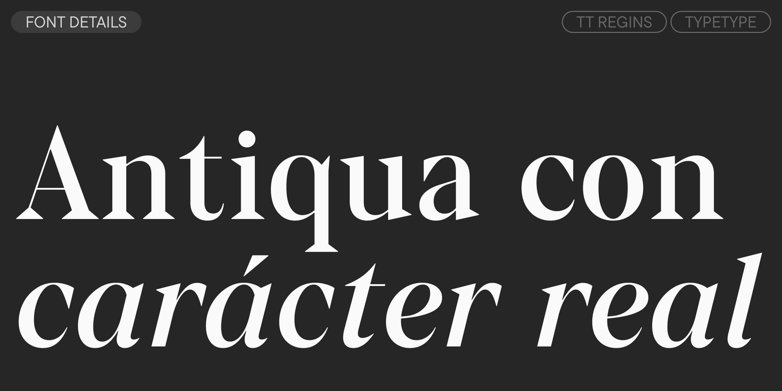 TT Regins es una serif moderna escocesa. Su marcado contraste y las agudas serifas triangulares le confieren un carácter severo y dominante, mientras que las formas refinadas, las letras minúsculas ampliadas y las proporciones ligeramente condensadas y estáticas aportan elegancia a su diseño.
