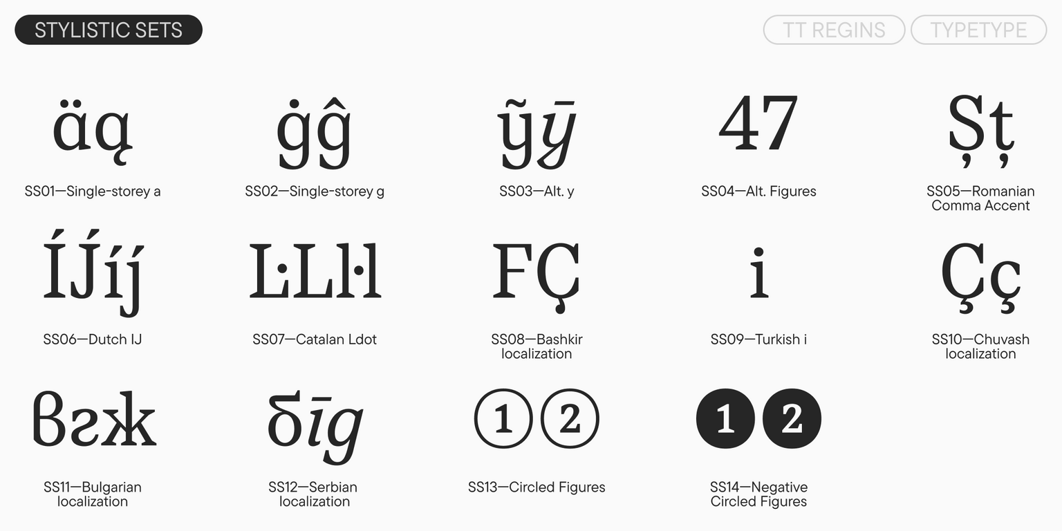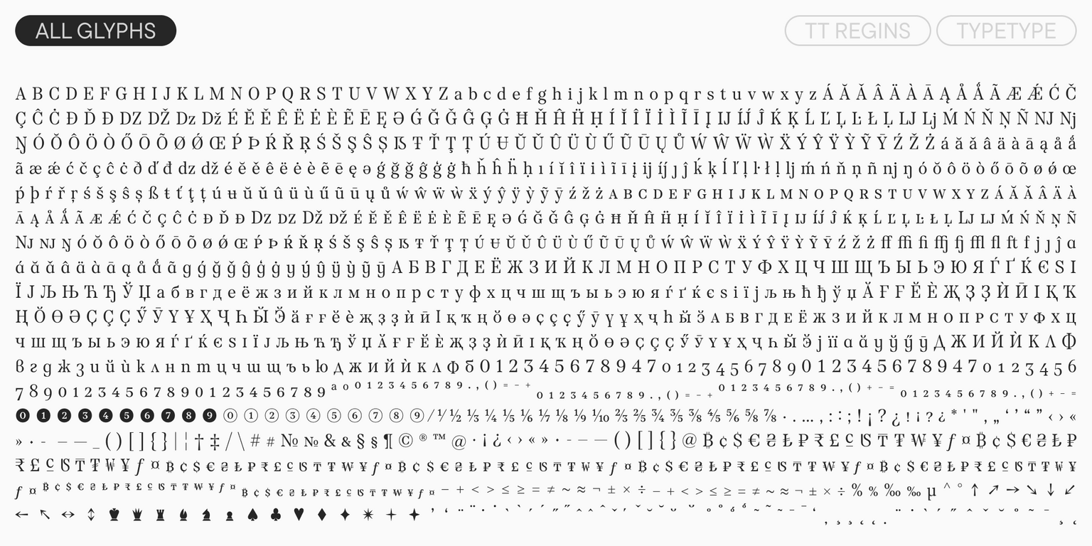 TT Regins es extremadamente versátil y funcional: los diferentes estilos pueden combinarse para distintas tareas, creando armoniosas parejas tipográficas dentro de una misma familia. Lucirá de forma impecable en revistas de moda, identidades visuales de museos e instituciones culturales, envases de perfumes y en el diseño de exposiciones históricas. Con su ayuda, es fácil transmitir una sensación de elitismo y sofisticación.