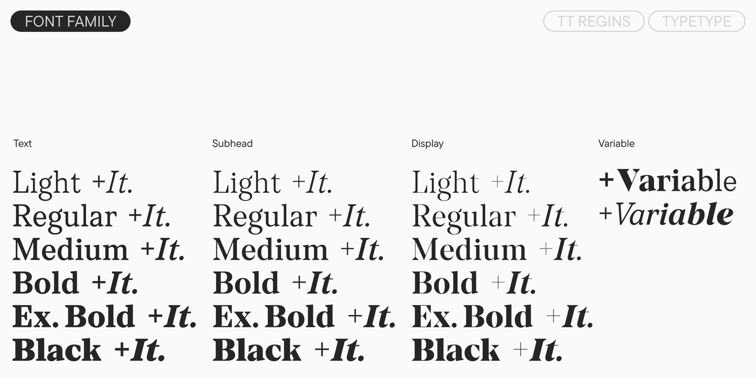 TT Regins incluye tres subfamilias con distintos grados de contraste: Display, Text y la intermedia Subhead. En la subfamilia Display, diseñada para inscripciones de gran tamaño, el contraste es más pronunciado y el carácter se expresa con mayor intensidad. En Text, el contraste se suaviza para mejorar la legibilidad, garantizando un funcionamiento impecable en textos corridos. Subhead puede utilizarse para acentos y titulares. Cada estilo está optimizado para un uso cómodo dentro de su rango de tamaños correspondiente: el eje de tamaño óptico permite adaptar el contraste y el grado de detalle del diseño.