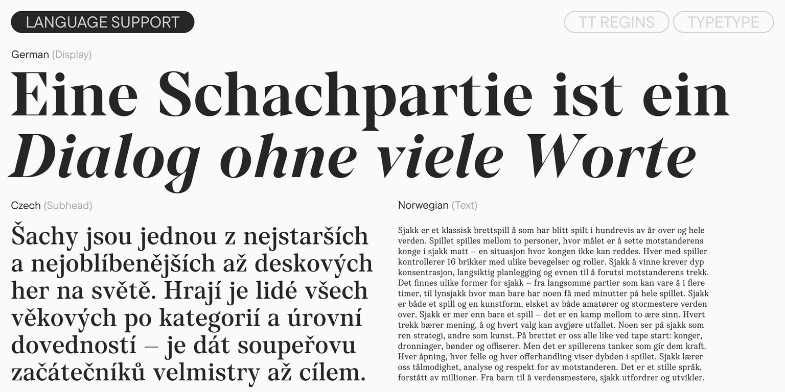 TT Regins incluye conjuntos estilísticos que permiten suavizar el carácter de la fuente. Sus posibilidades se amplían también gracias a dos fuentes variables que permiten trabajar con distintos grosores y tamaños ópticos en estilos rectos y cursivos. Además, añadimos un conjunto temático de íconos con motivos de ajedrez y naipes.