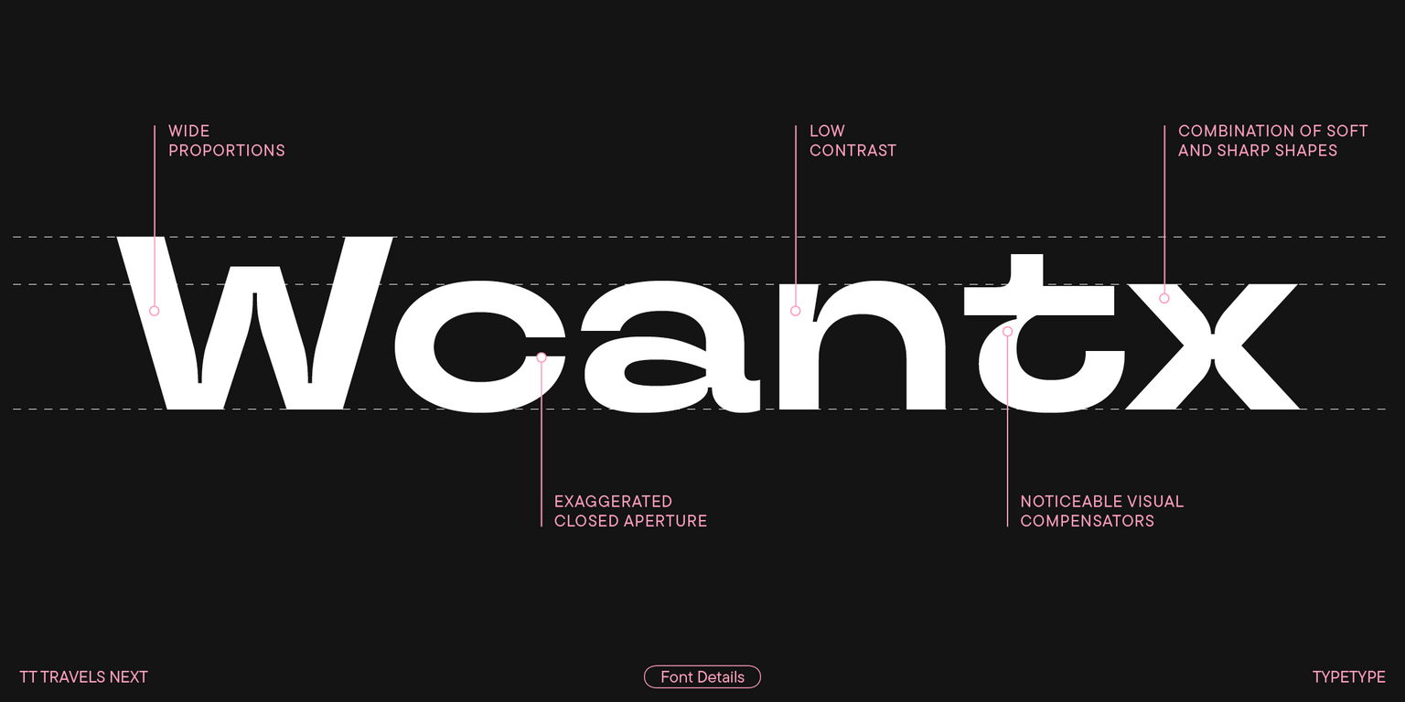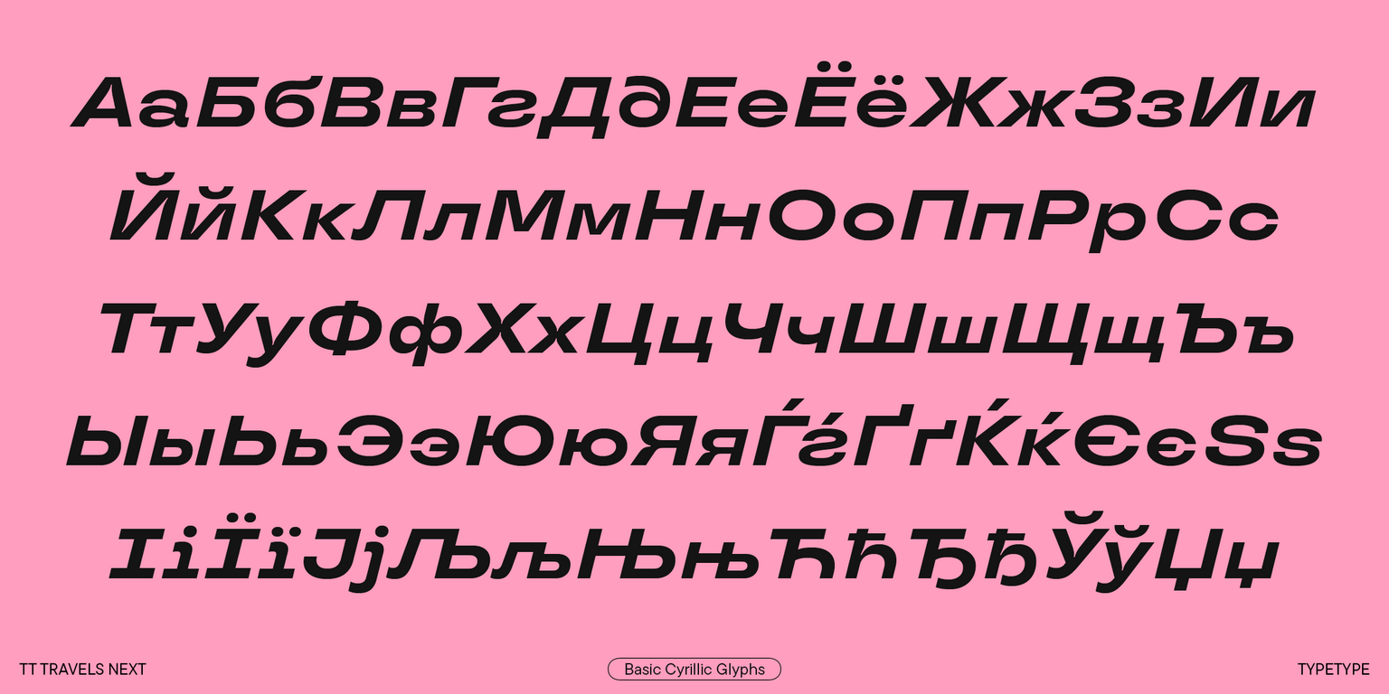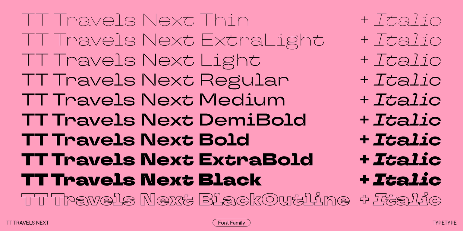 TT Travels Next es un gran grotesco ultramoderno. Las amplias proporciones son una de las características distintivas de este tipo de letra: los caracteres casi no se estrechan al pasar de un estilo grueso a uno fino. Además, la fuente presenta una apertura ultracerrada, bajo contraste y compensadores visuales notables. Curiosamente, TT Travels Next combina formas suaves y nítidas al mismo tiempo, lo que lo hace versátil, inusual y atractivo. Y con las fuentes en cursiva, hemos aumentado intencionalmente el ángulo de dibujo a 14 grados para que puedas escribir letras nítidas y dinámicas.