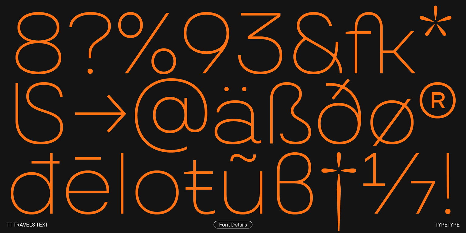 Las principales diferencias visuales de TT Travels Text son sus proporciones bastante amplias y sus formas ovaladas ligeramente cuadradas. Para que la fuente sea más fácil de leer, hicimos la altura de la línea más alta que en el TT Travels original y la apertura más abierta. También trabajamos con proporciones y contornos, reducimos ligeramente las formas de los óvalos y reelaboramos el grosor de los maestros para que, cuando se combine con TT Travels Next, la versión de texto pareciera armoniosa. También nos deshicimos de las trampas de tinta en el estilo negrita, haciendo la fuente más neutral y moderna.