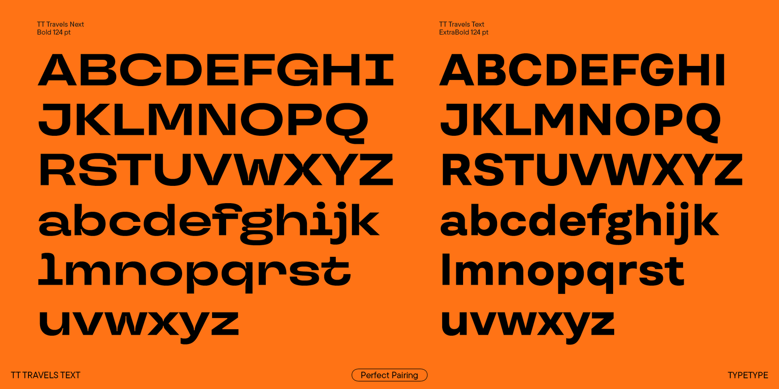TT Travels Text es un sans serif geométrico con amplias proporciones. Al crear esta fuente, buscamos conservar la idea básica y las características reconocibles de la ya familiar TT Travels, pero hacerla más limpia y moderna. El resultado es un tipo de letra independiente que no solo será una combinación de texto ideal para TT Travels Next, sino que también funciona muy bien solo.
