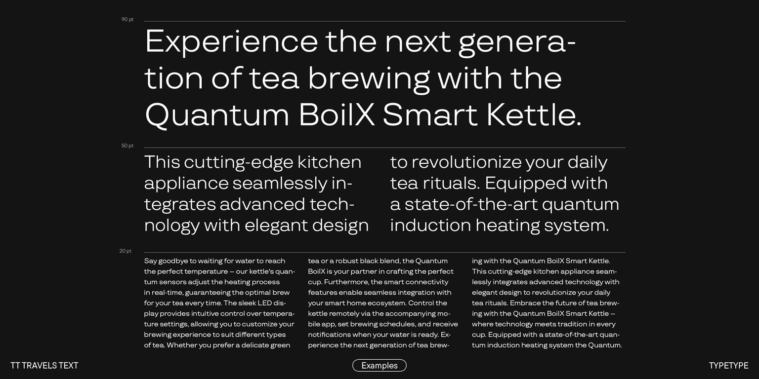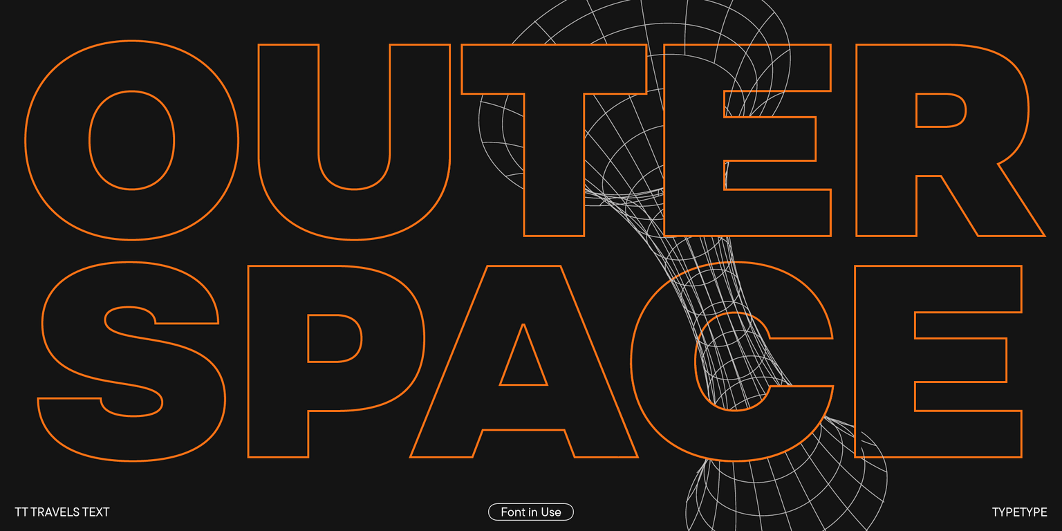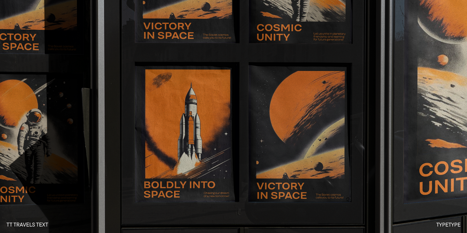 Gracias a las características gráficas que enumeramos anteriormente, TT Travels Text se puede utilizar no solo en matrices de texto, sino también en identidad, web e impresión, como un acento gráfico independiente. La fuente lucirá armoniosa en el diseño de libros y revistas, en carteles y carteles y en el diseño de envases. Al mismo tiempo, gracias a su carácter neutral, su ámbito de aplicación no está limitado y, cuando se combina con TT Travels Next, la fuente revela todo su potencial.
