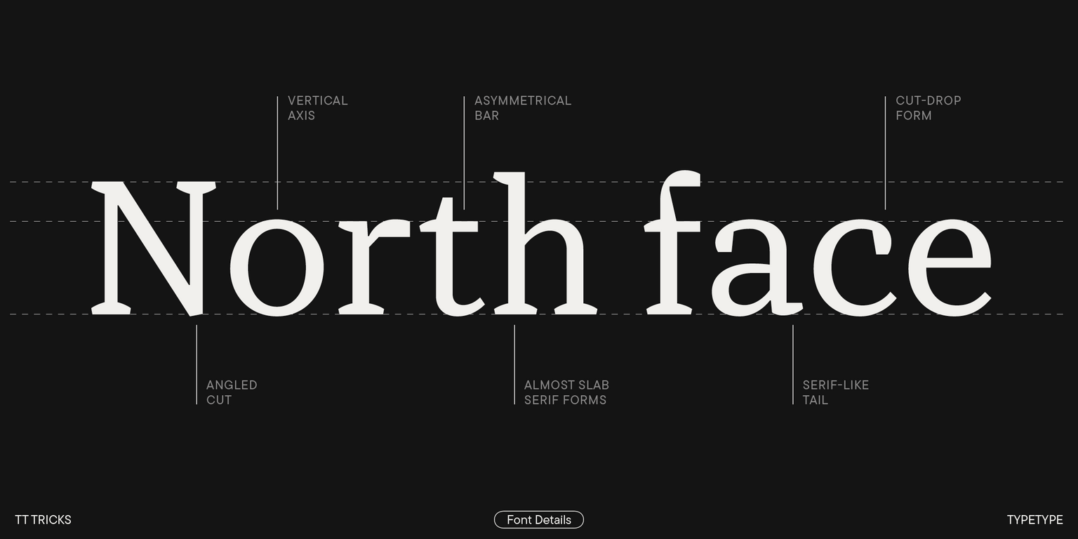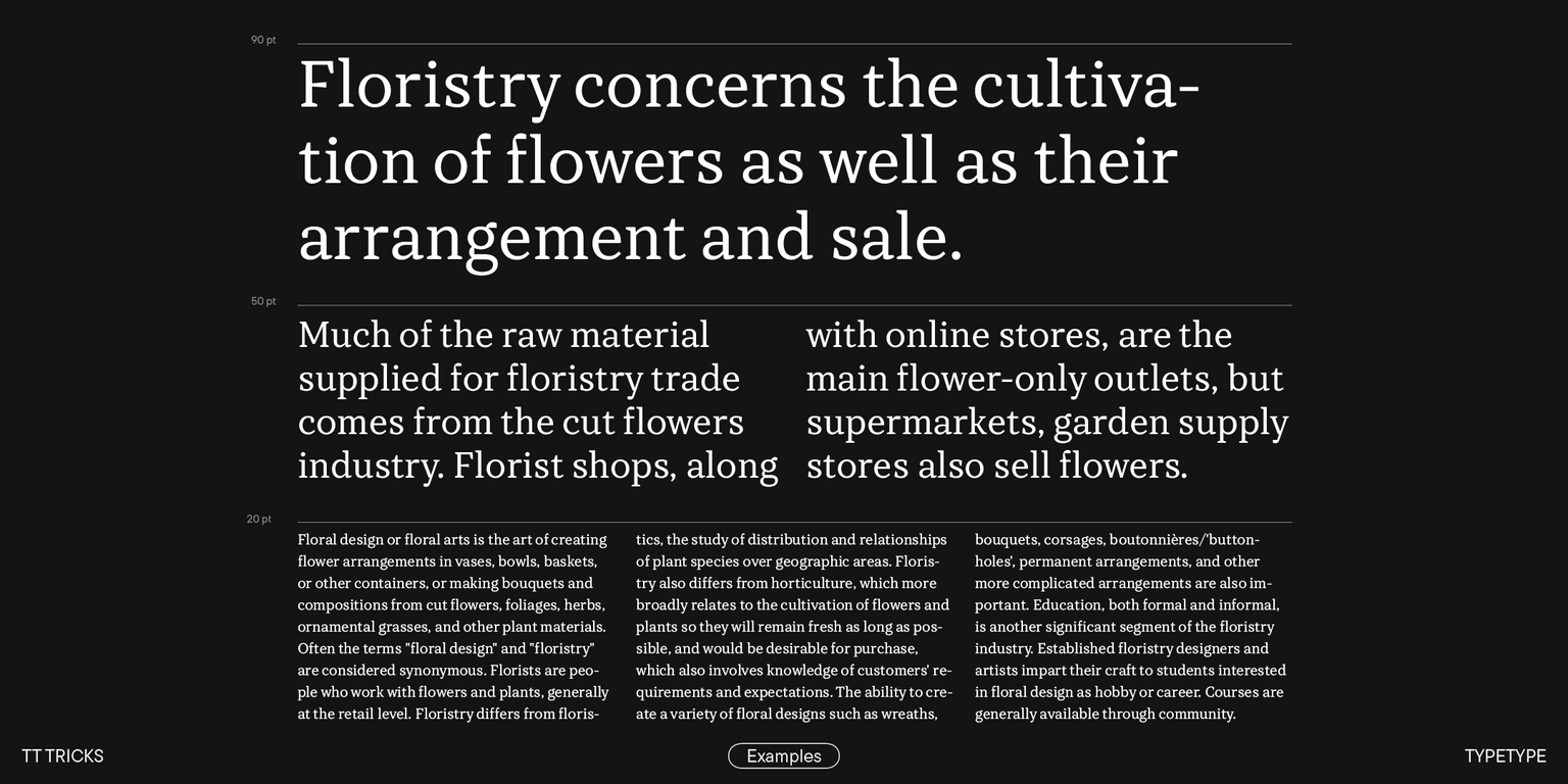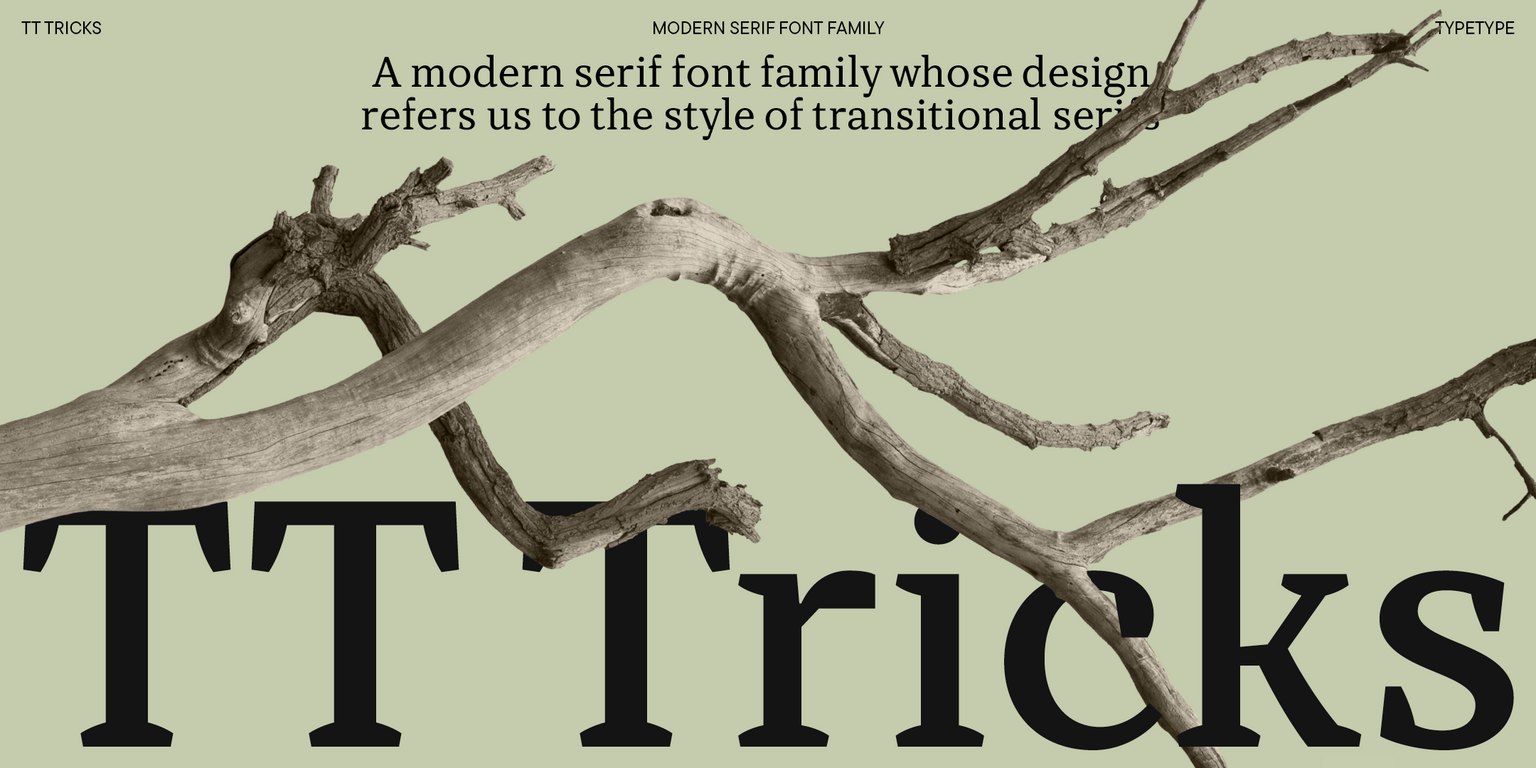 TT Tricks es una serif moderna para texto, diseñada con un estilo que refleja las serifas Transicionales. Este tipo de letra tiene un carácter sereno, elegante y moderadamente formal. Se distingue por su bajo contraste en los trazos, grandes serifas, proporciones reducidas y formas ligeramente cuadradas en los caracteres redondos. Todos estos aspectos visuales le otorgan un tono claramente formal.