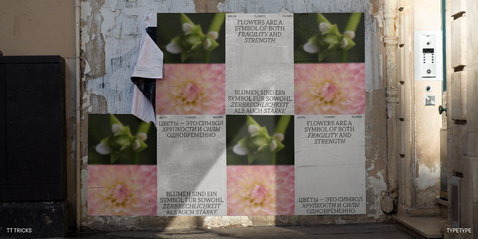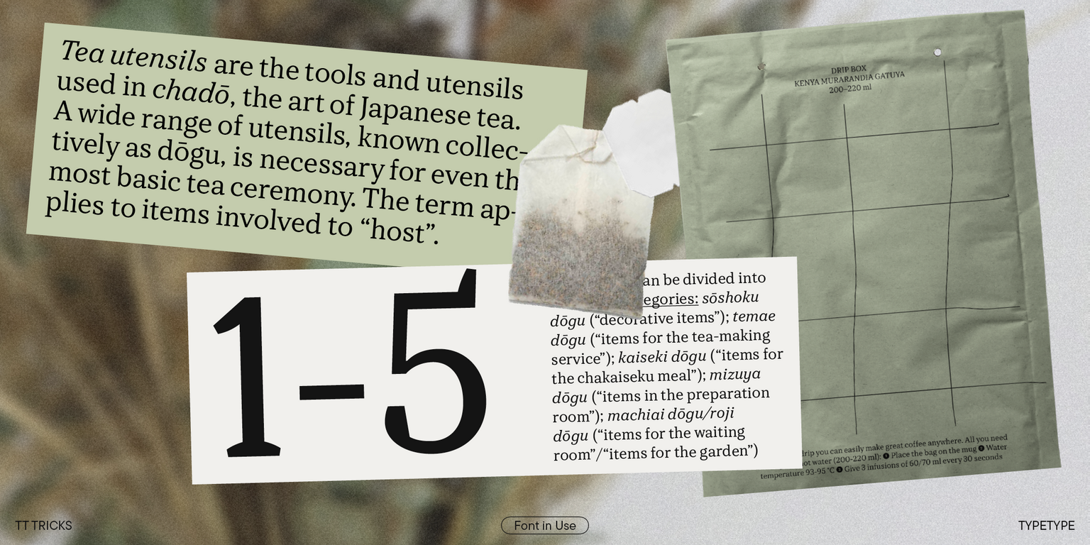 TT Tricks es un auténtico clásico : discreto pero altamente relevante. Gracias a su apariencia, la fuente tiene un amplio rango de aplicaciones. TT Tricks revela un potencial totalmente diferente dependiendo del contexto en el que se use. Tiene una excelente legibilidad en tamaños pequeños y muestra detalles expresivos en tamaños grandes, luciendo muy estética.