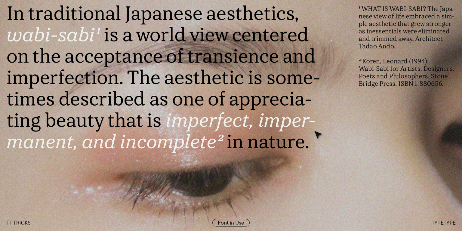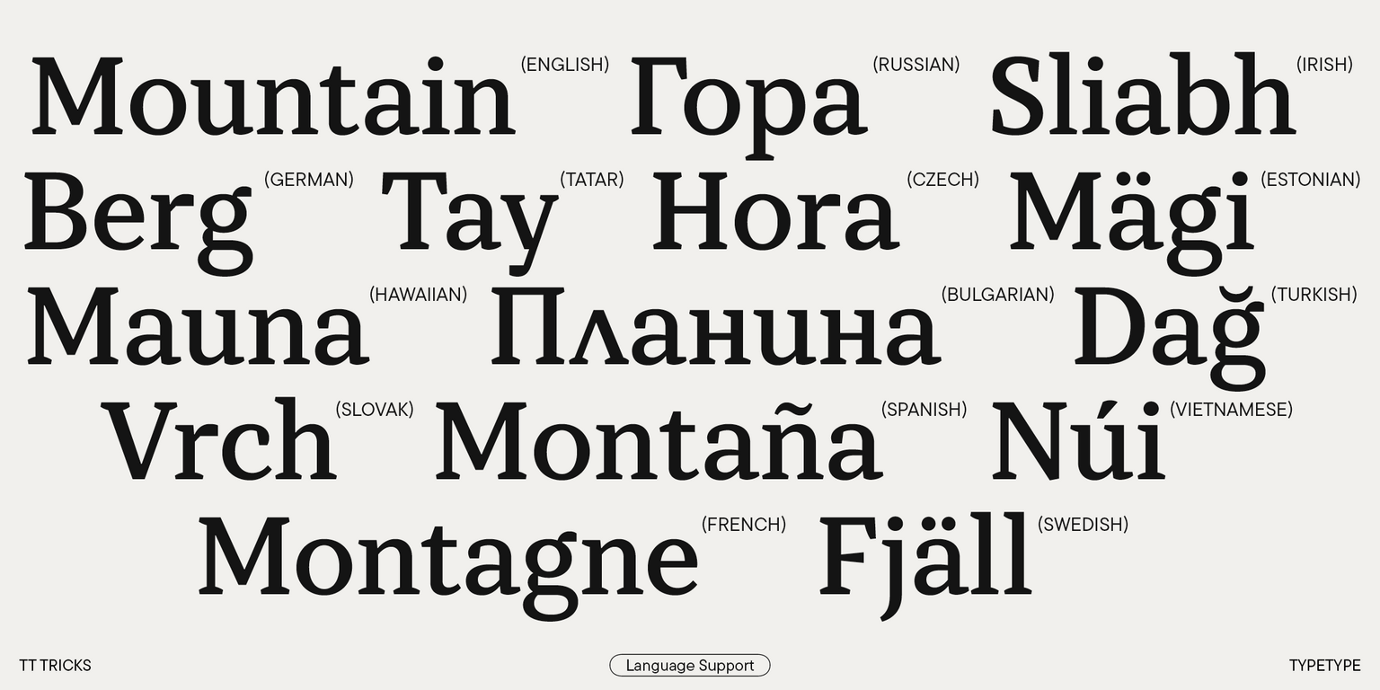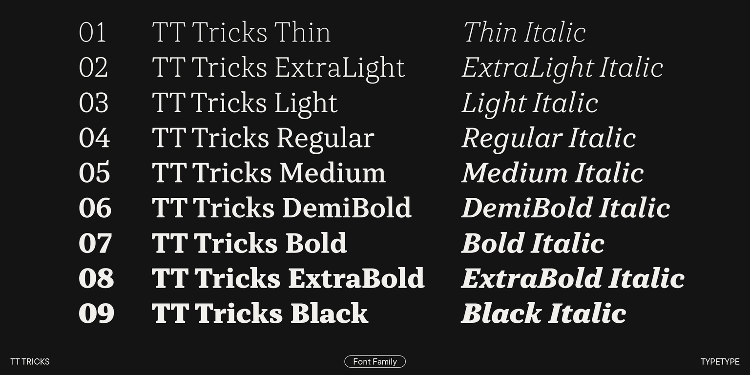 ¡Presentamos TT Tricks, versión 2.000! Hemos mejorado esta discreta serif amplificando su conjunto de caracteres, añadiendo más idiomas soportados, nuevas funciones OpenType, fuentes variables y optimizando sus características visuales y técnicas.