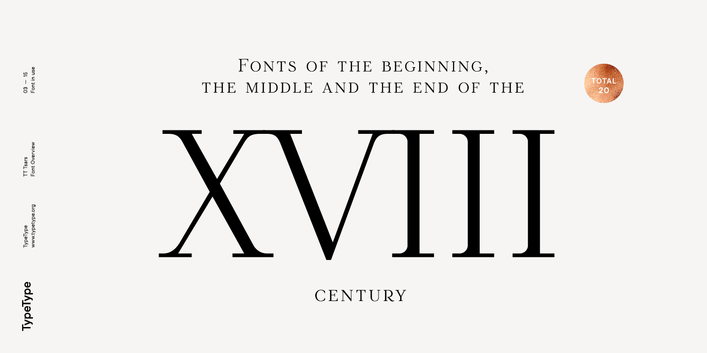 TT Tsars C es de mediados del siglo XVIII. El alfabeto cirílico en sí no se detuvo y evolucionó, y a mediados del siglo XVIII sus formas cambiaron y se convirtieron en la forma en que se muestran en esta familia de alfileres. Las formas latinas del formulario están alcanzando ligeramente al alfabeto cirílico. Los números también se han modificado ligeramente y se han adaptado al diseño de la fuente. En TT Tsars C, los alfabetos cirílico y latino se crean en paralelo. Una característica distintiva del alfabeto cirílico en TT Tsars C es la influencia residual de la pluma plana. Esto se nota en signos como З, Ж, K. Las formas de las letras Р, Ц, Щ, Э son muy características de la época. En el alfabeto latino, aparece una pierna característica en la letra R. Ambos idiomas. se caracterizan por una C con una serifa superior y la aparición de serifas grandes, incluso algo atrevidas, en líneas horizontales (T, E, Г, L).