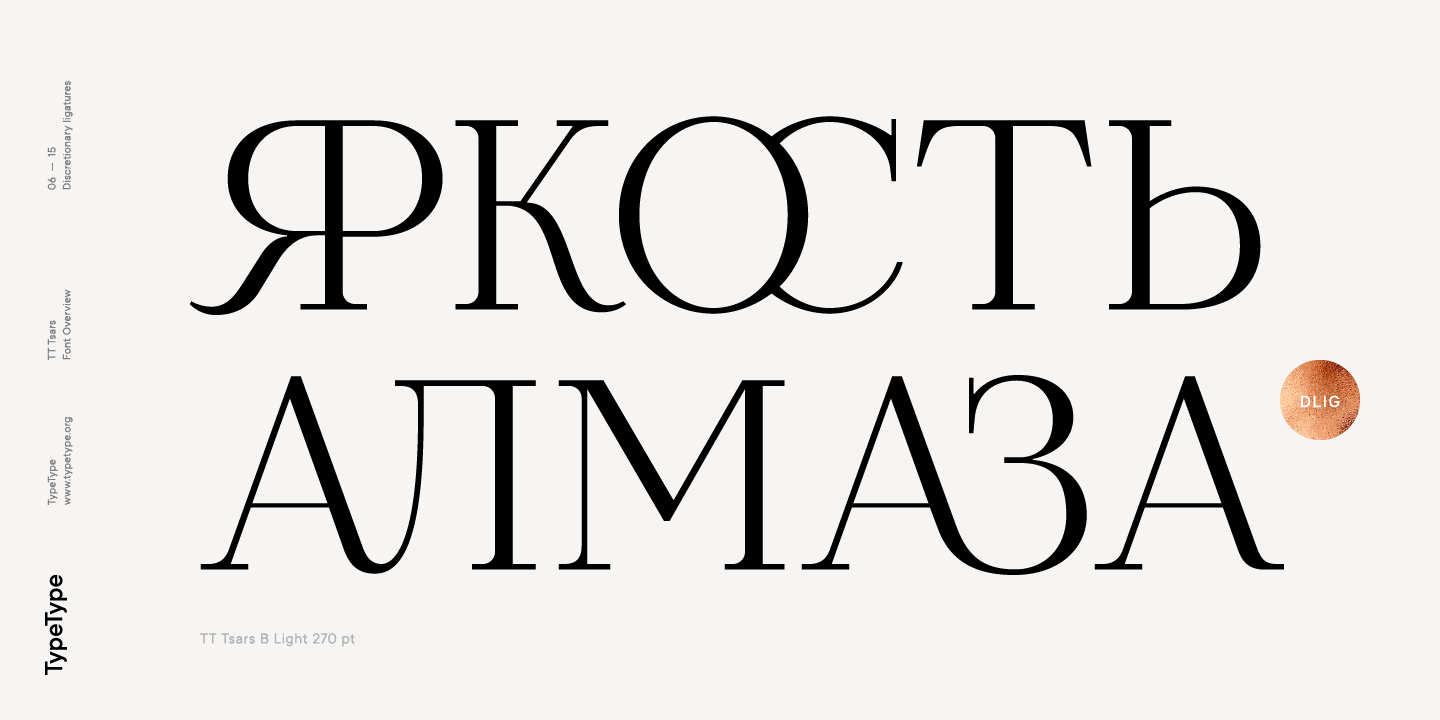 TT Tsars D ya es un período de finales del siglo XVIII, cuando, con el desarrollo de la imprenta, las formas de algunos caracteres cirílicos cambiaron y se convirtieron en nuevos esqueletos de letras, que transpusimos al latín, los números también fueron estilizados. En esta fuente, estilísticamente, tanto el alfabeto cirílico como el latino están hechos con serifas diferentes y, por lo tanto, están lógicamente separados. El final de siglo se caracteriza por una reducción de los elementos decorativos. Patas rectas, dibujadas de las letras Я, R, K, Ж. Las serifas son pronunciadas, triangulares. En la horizontal media, E y Э son unilaterales. En el alfabeto latino aparece una C muy característica con dos serifas.