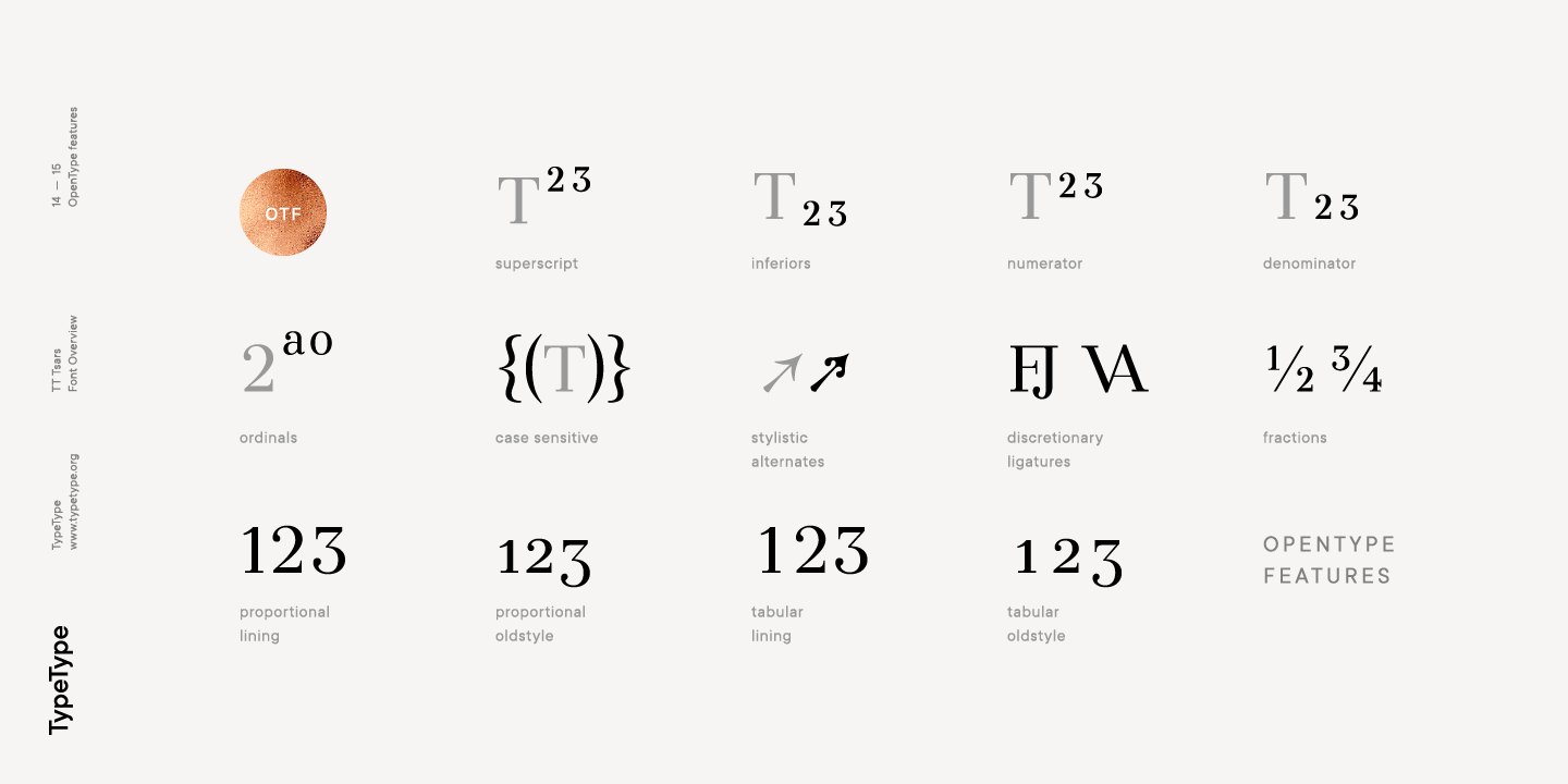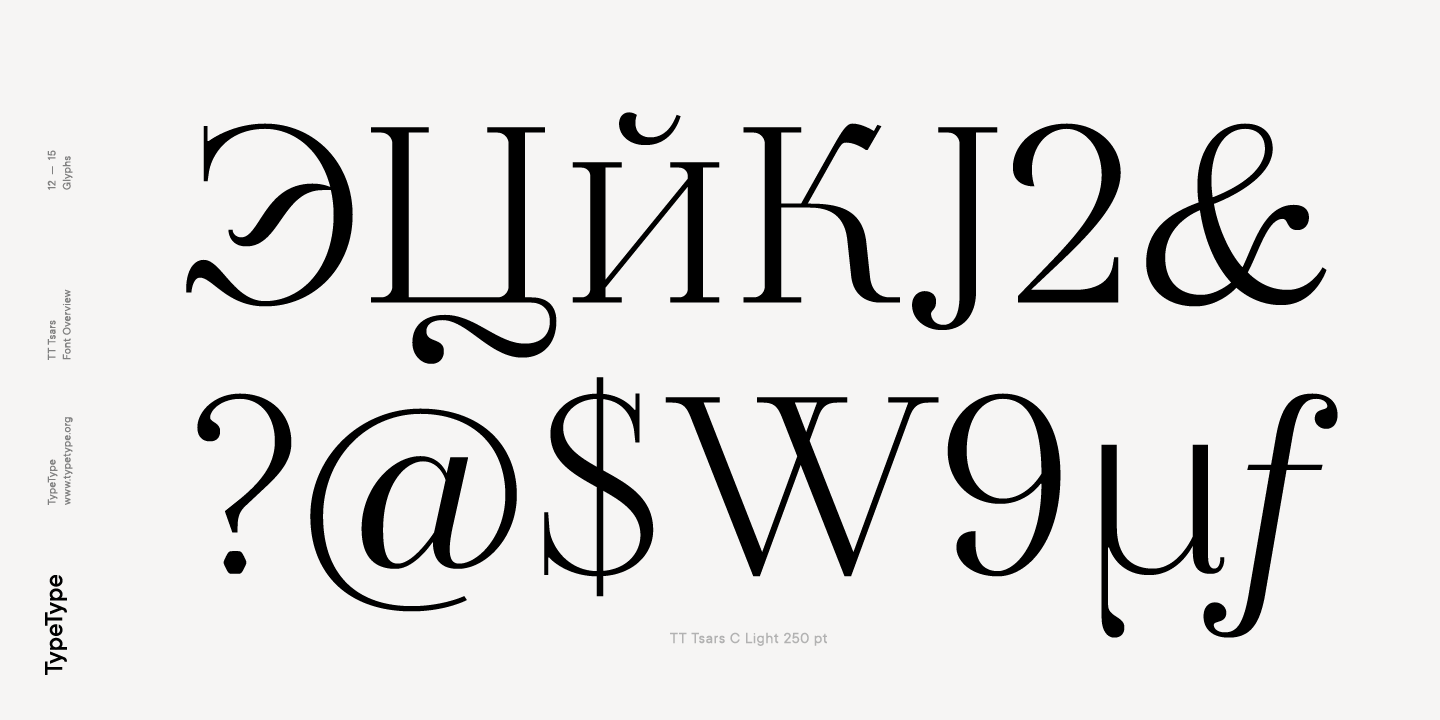 La familia tipográfica TT Tsars consta de 20 fuentes: 5 subfamilias independientes, cada una de las cuales consta de 4 estilos. Cada fuente contiene 580 glifos, excepto el tipo de letra E, en el que cada fuente consta de 464 caracteres. En lugar de caracteres en minúsculas, las fuentes usan mayúsculas, lo que también da a entender que la fuente es más visible que texto. En TT Tsars puedes encontrar una gran cantidad de ligaduras (para latín y cirílico), flechas, tiradores y muchas funciones OpenType útiles, como: frac, ordn, sinf, sups, numr, dnom, case, onum, tnum, pnum, lnum, sal (ss01), dlig.