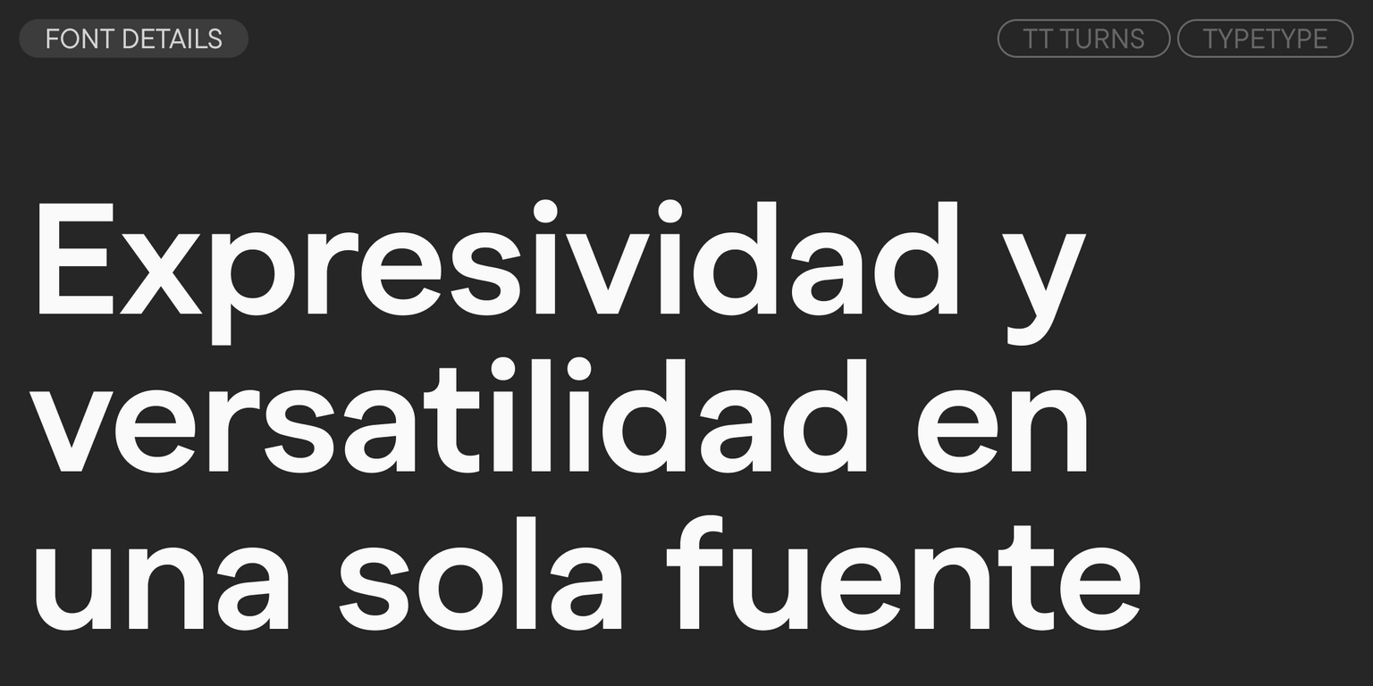 TT Turns es adecuada para una gran variedad de tareas: desde texto continuo, web y aplicaciones hasta branding y diseño de envases. Puede utilizarse con la misma eficacia prácticamente en cualquier ámbito.