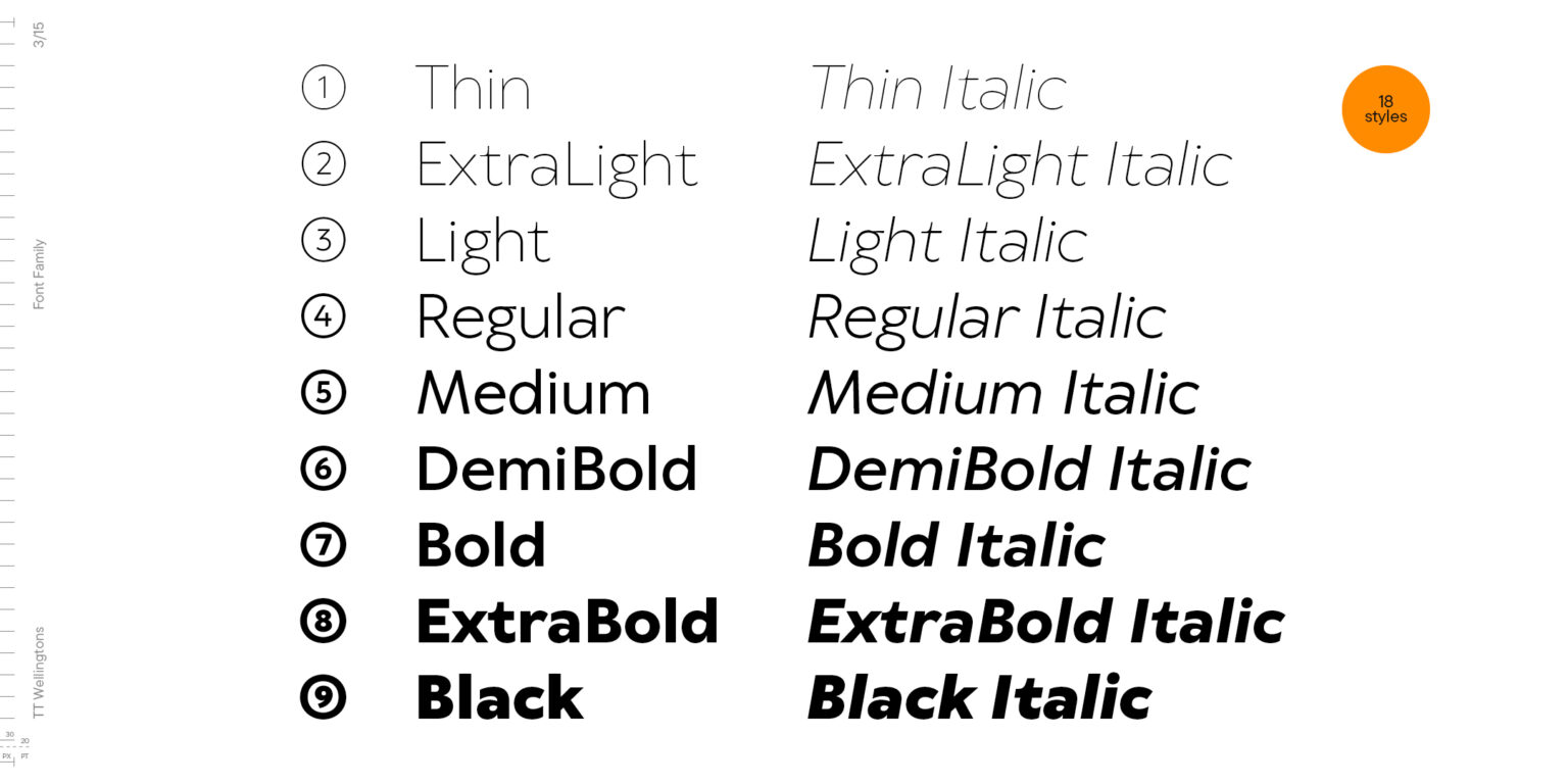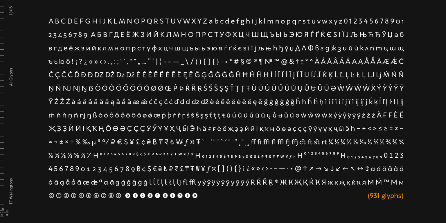 TT Wellingtons es una sans serif humanista cuyas formas remiten al movimiento de una pluma de punta ancha. Las líneas plásticas de las letras del tipo de letra actualizado, características de las fuentes humanísticas inglesas del siglo XX, parecen relevantes y vivas en los proyectos de diseño modernos.