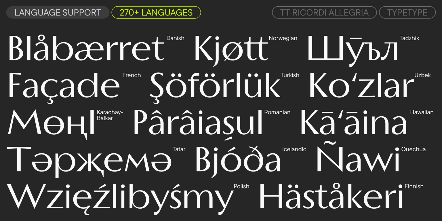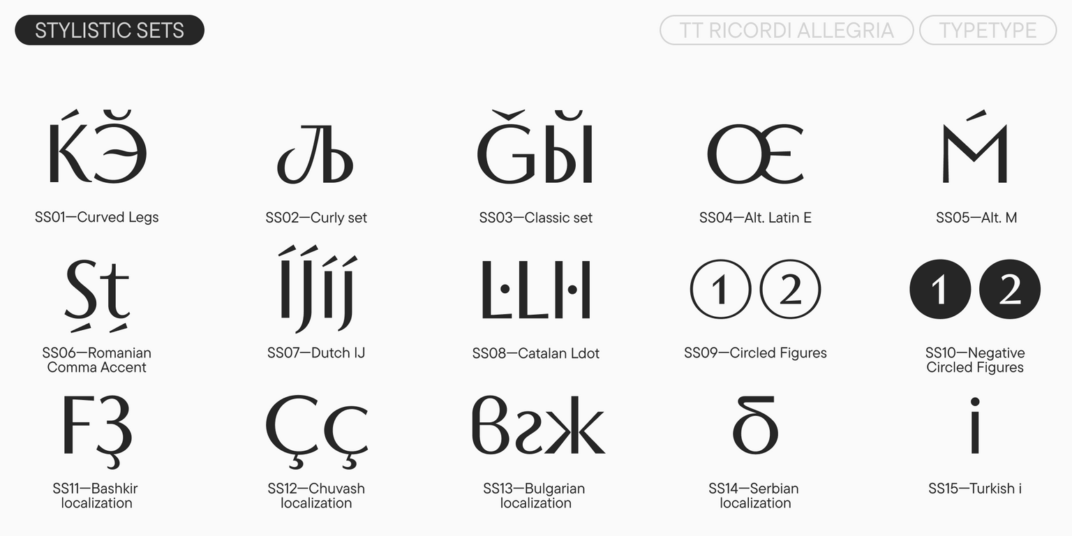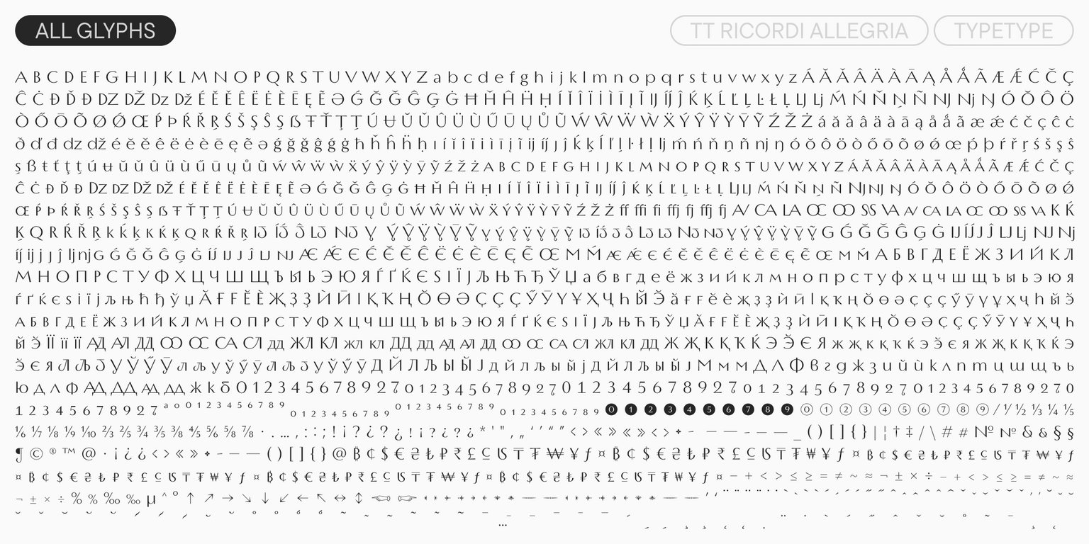 Introducing TT Ricordi Allegria version 2.000—now with a lowercase set! This typeface has undergone a major update: we’ve significantly expanded the character set, added new font styles, and introduced a host of new features.