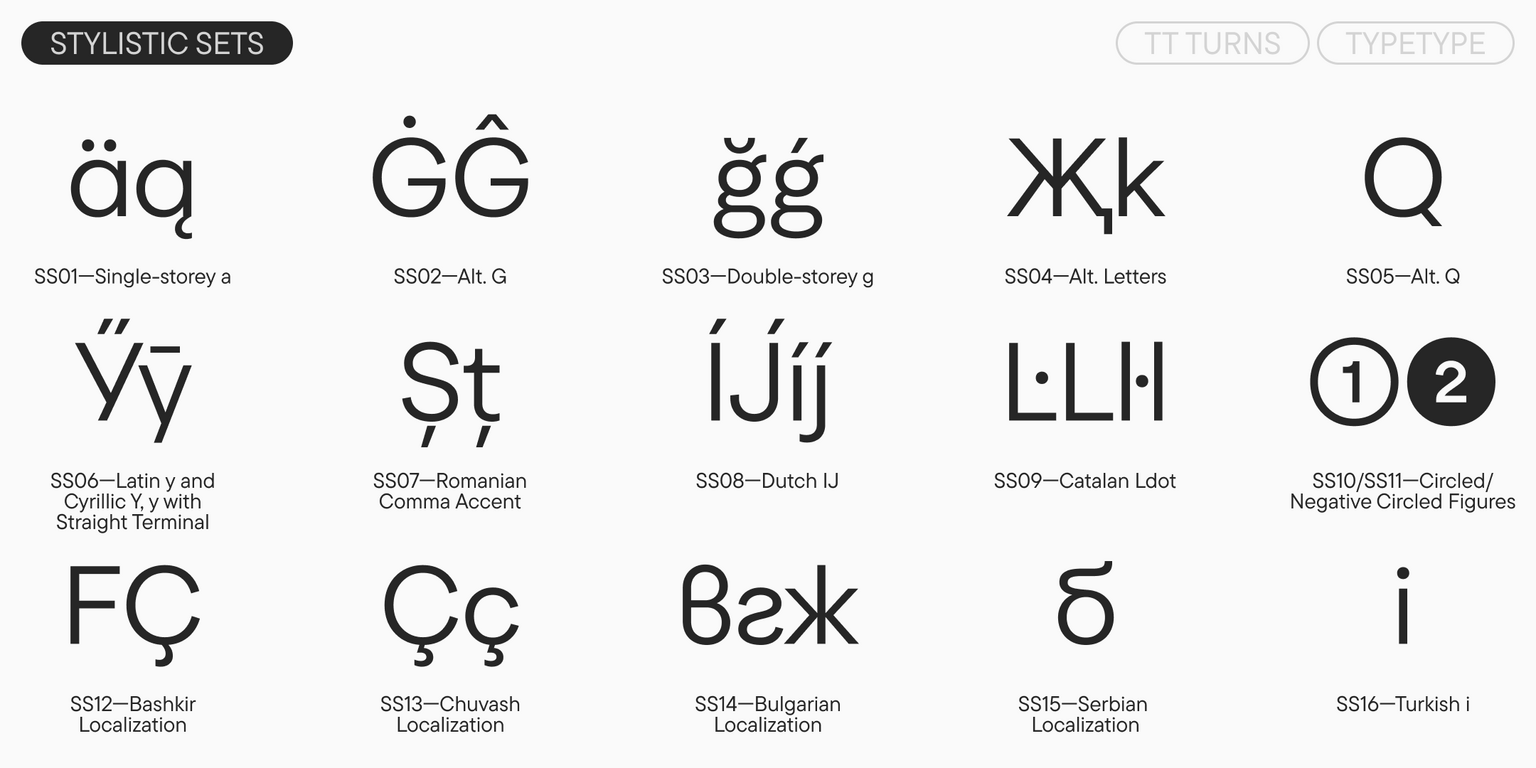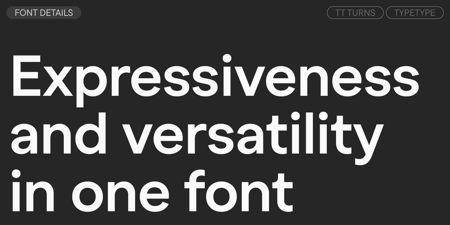 TT Turns is suitable for a multitude of different tasks: from use in running text, on the web, and in applications to branding and packaging design. It can be used with equal effectiveness in virtually any field.