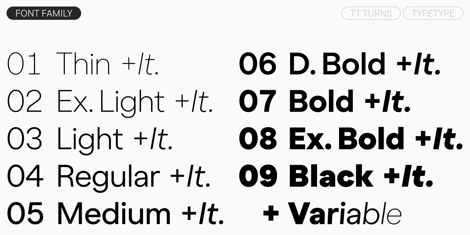 TT Turns is a geometric sans serif with distinctive rounded glyphs and expressive overhanging elements. This versatile font has a concise appearance and is highly readable at small sizes, while at large point sizes, it becomes a display font and reveals its character to the fullest. It’s energetic, strong, and dynamic—a quality that is especially evident in the italic font styles.